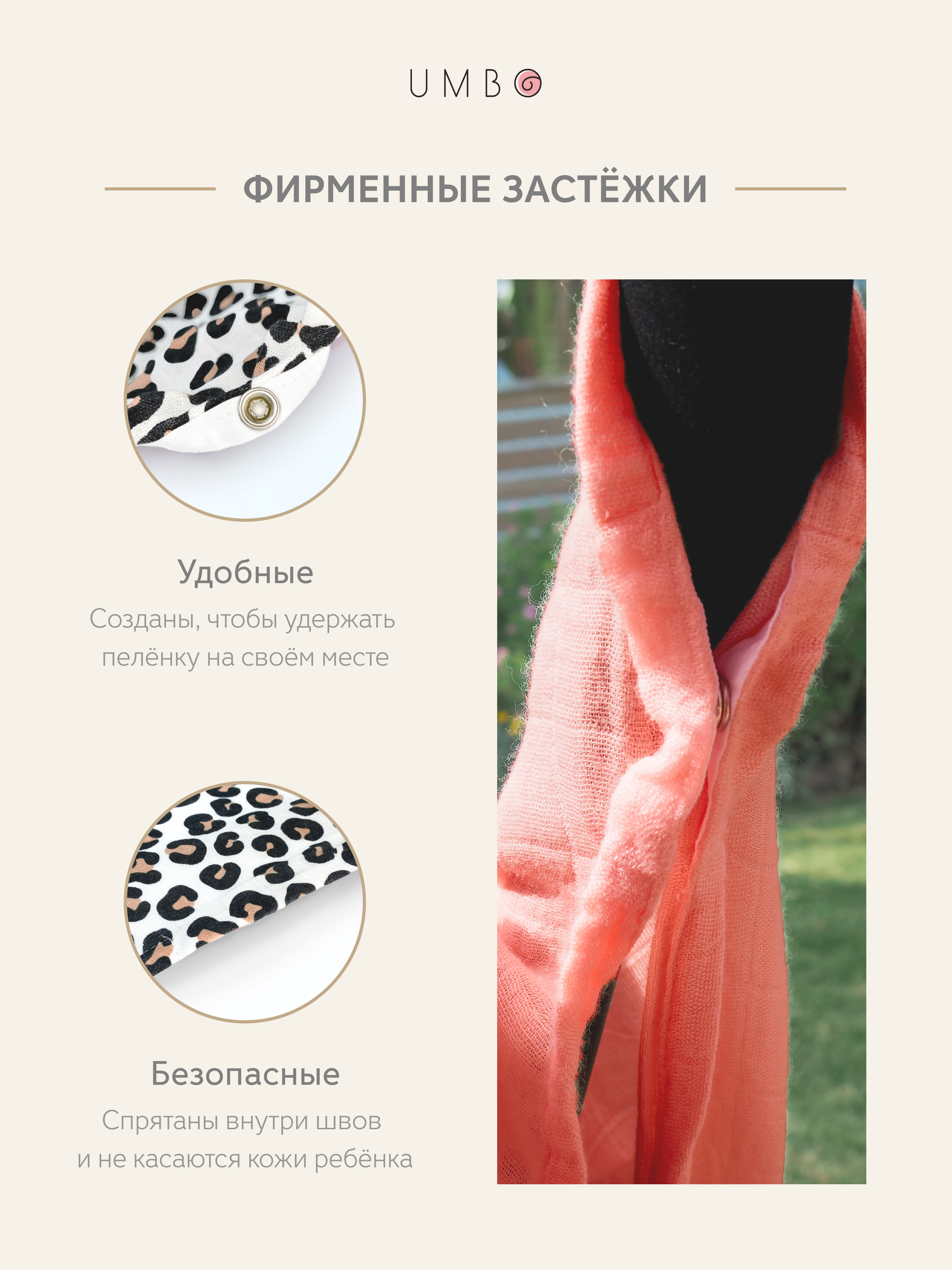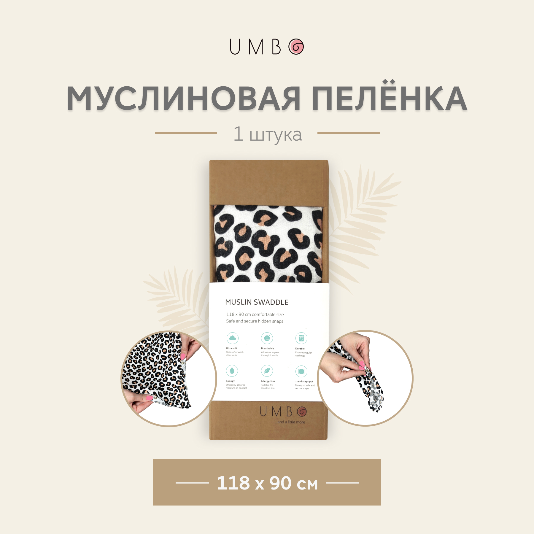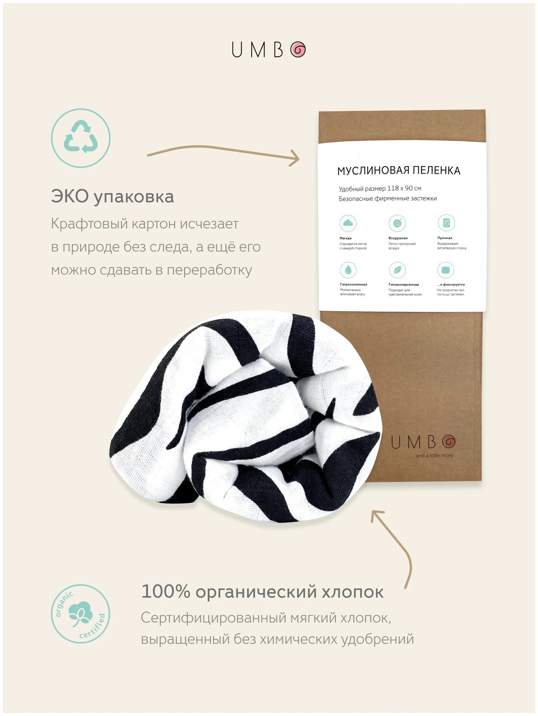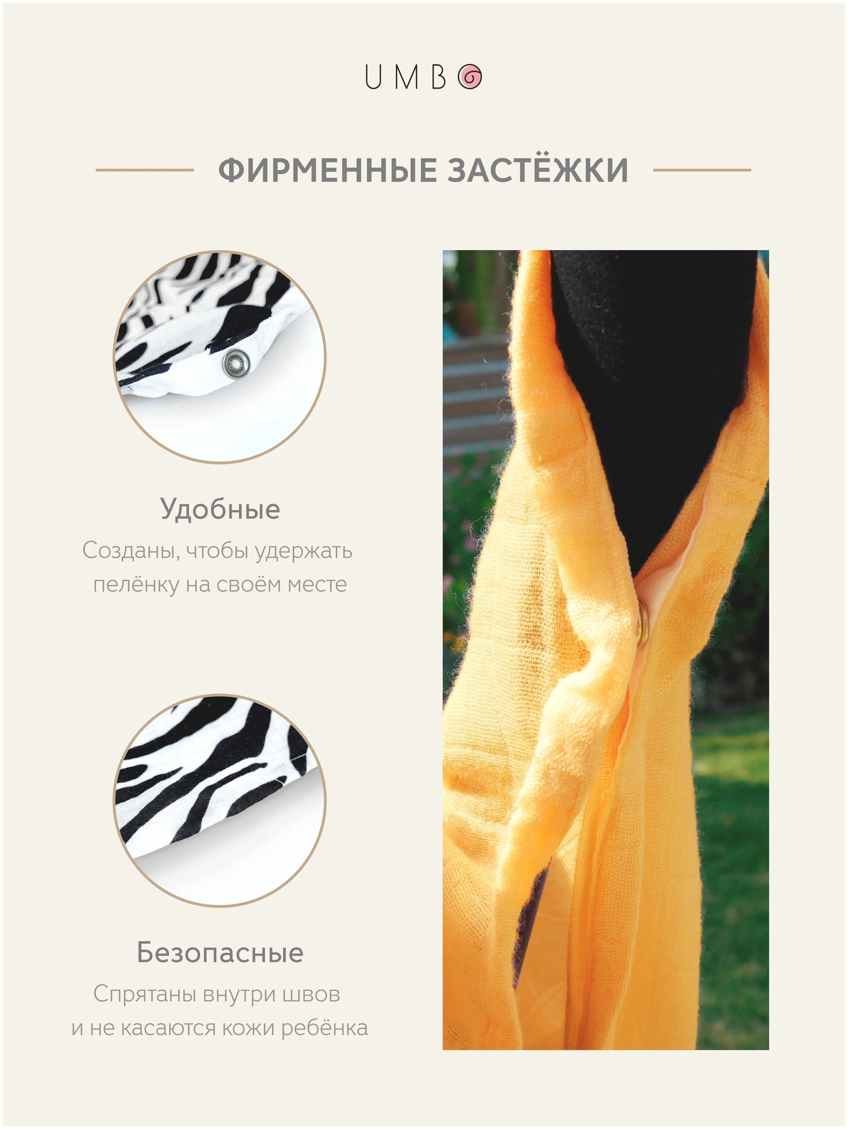 Пеленка текстильная UMBO с внутренними застежками, 90 x 120 см, Муслин
