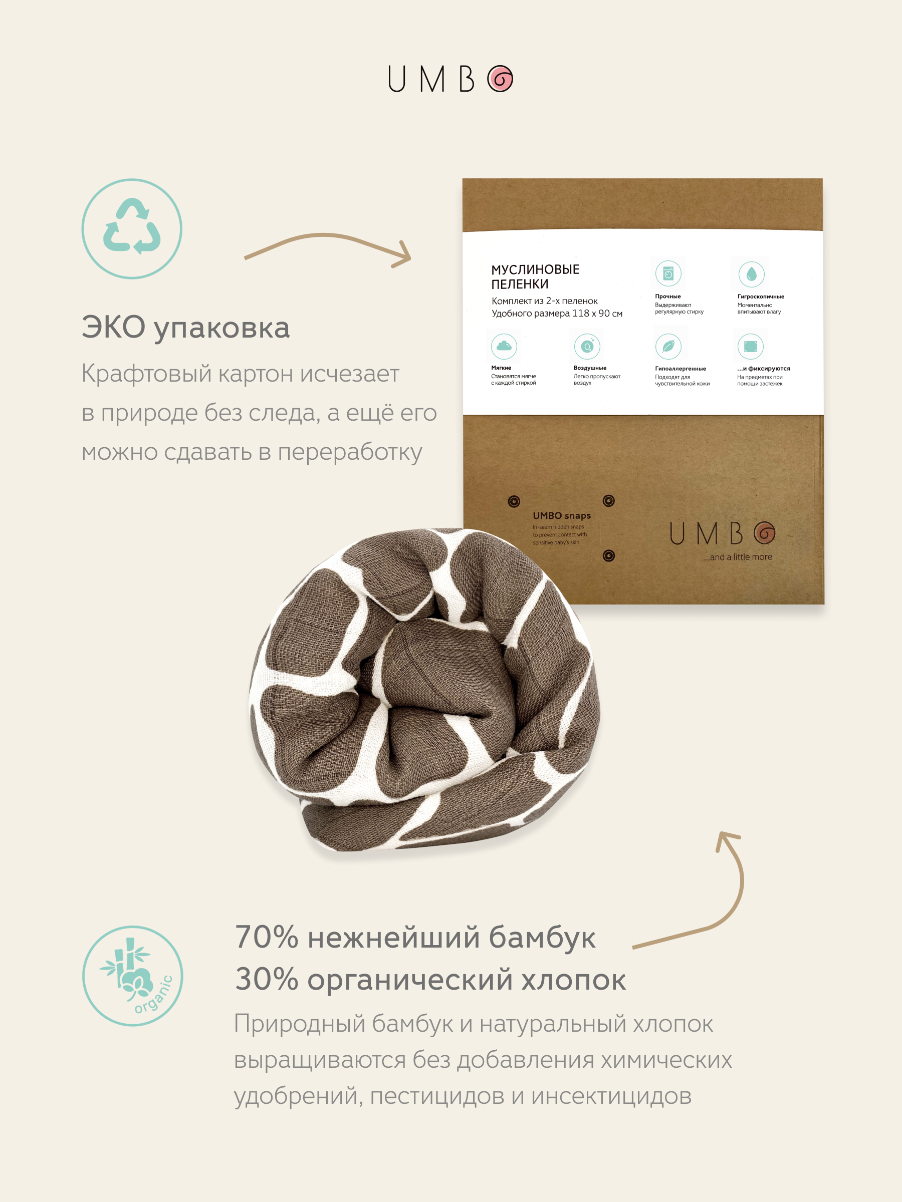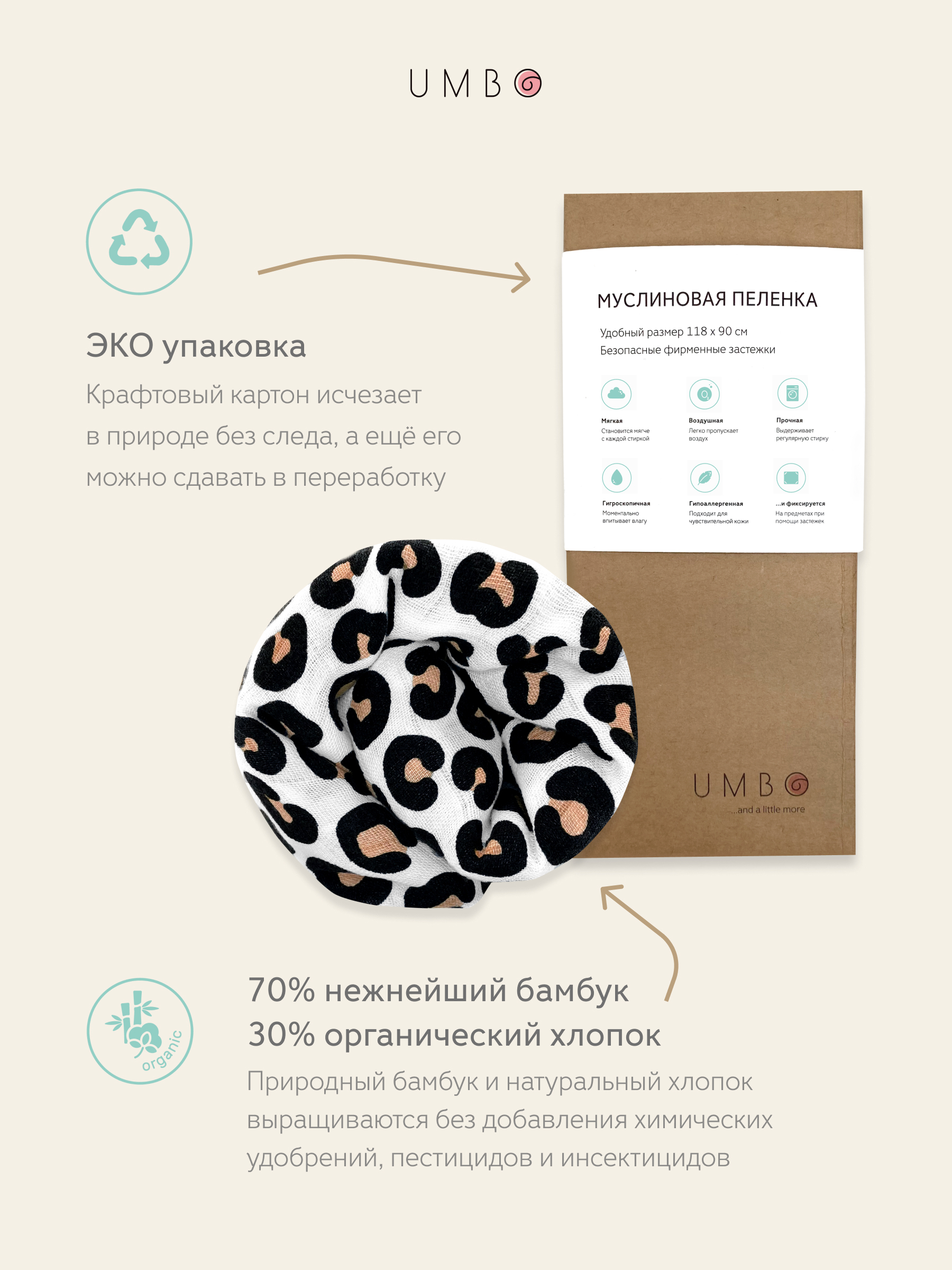 Пеленка текстильная UMBO 90 х 120 см, Бамбук, Хлопок, 1 шт Сафари