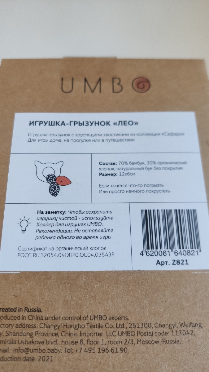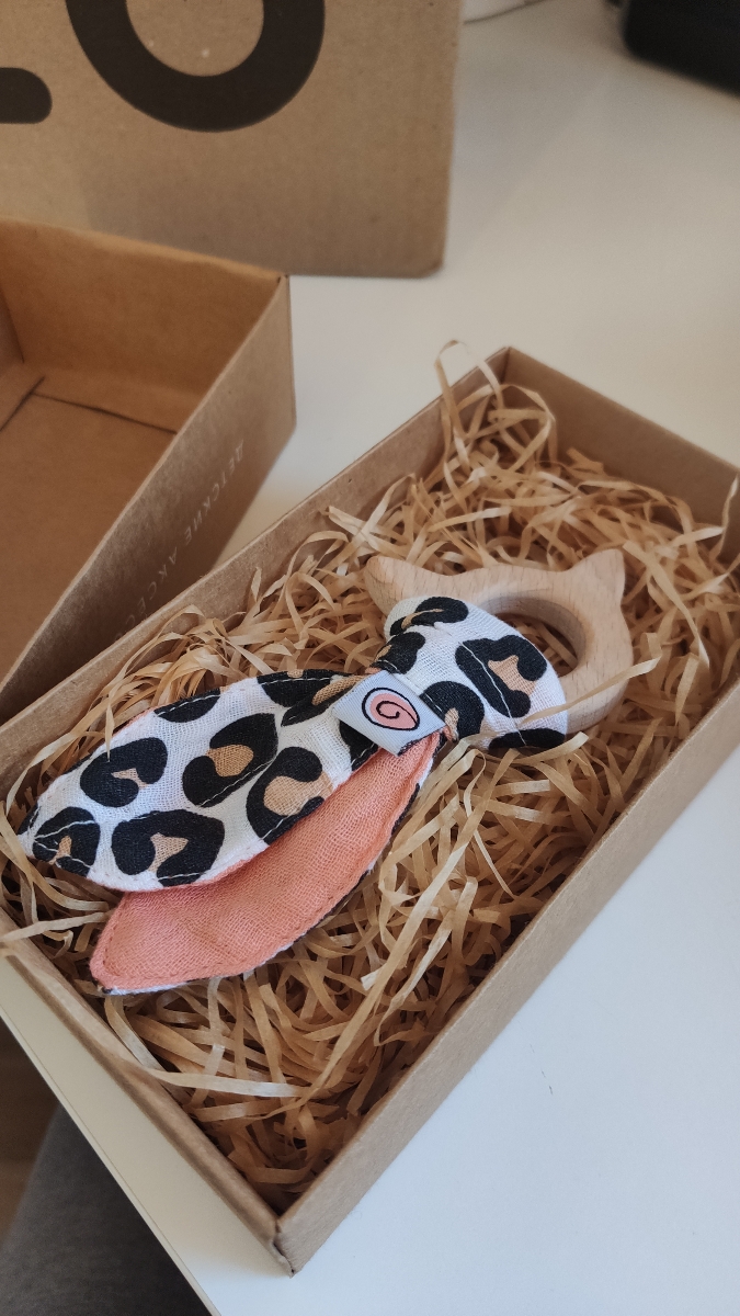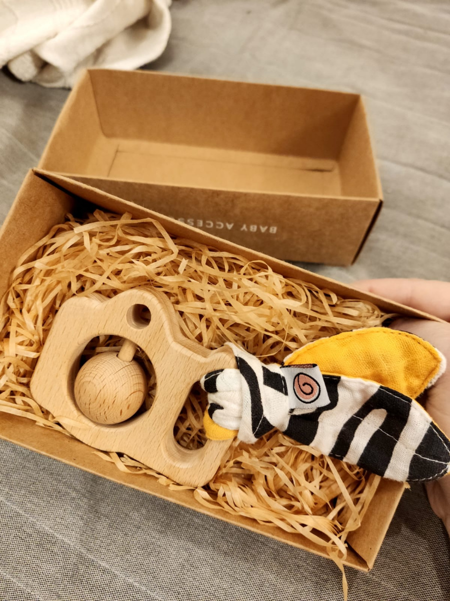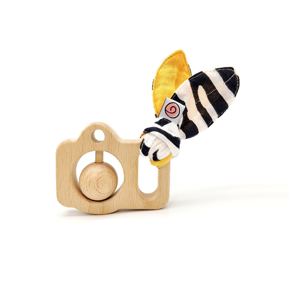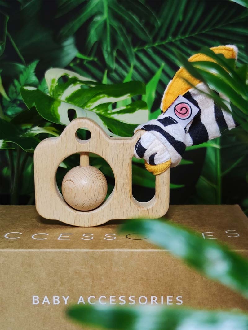 Погремушка-грызунок "Фото-Сафари" UMBO из бука с хрустящими муслиновыми хвостиками