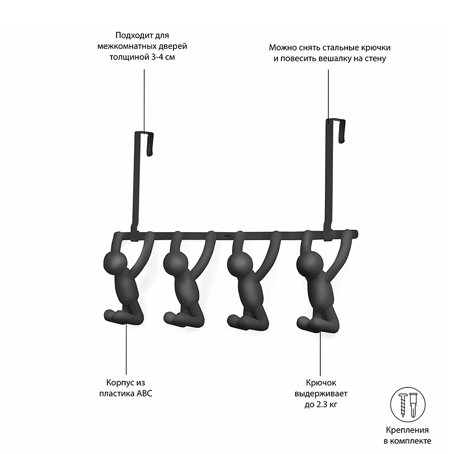 Вешалка в прихожую Вешалка надверная BUDDY 4 крючка черная, 46.3х14.7х6.7 см