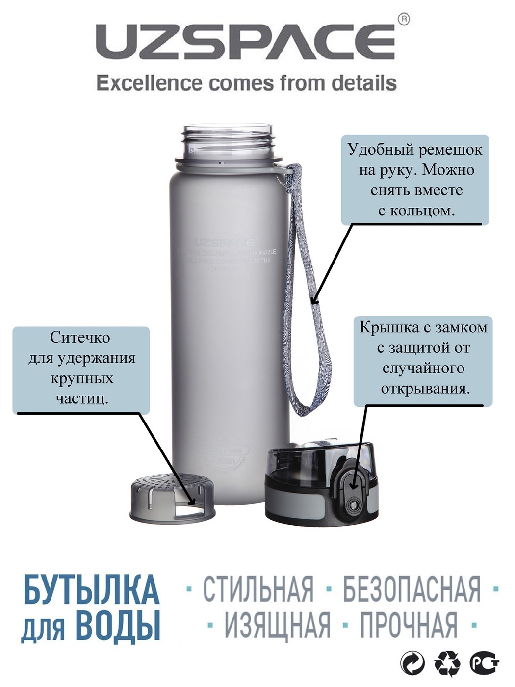 Спортивная бутылка UZSPACE Colorful Frosted Series Button lid 1000, серый