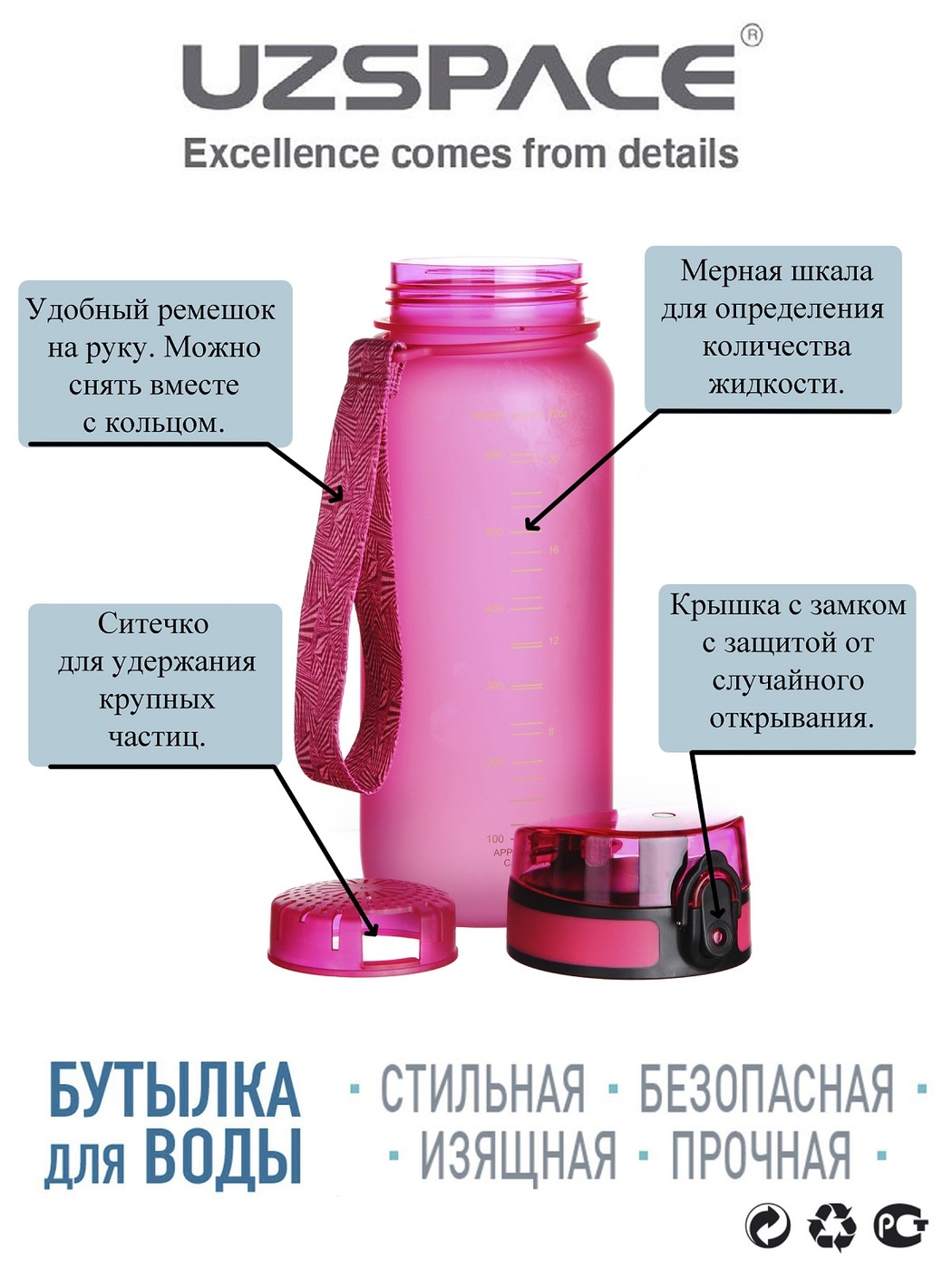 Спортивная бутылка, Sports Bottle Straw 350 UZSPACE, 350л., розовый