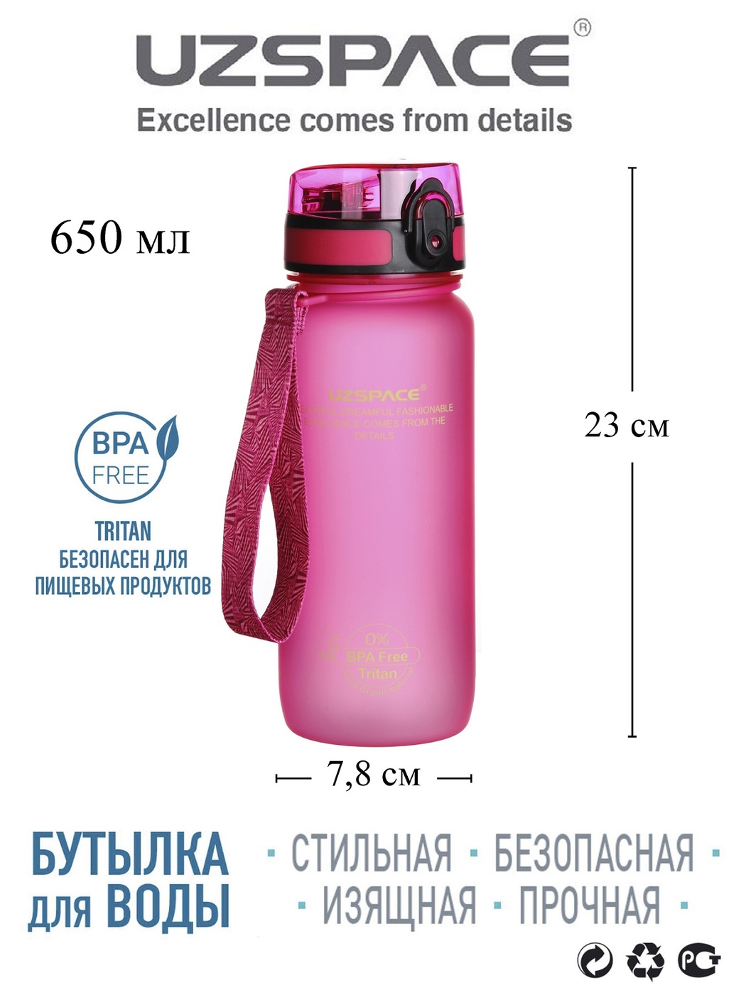 Спортивная бутылка UZSPACE Colorful Frosted Series Button lid 650, розовый