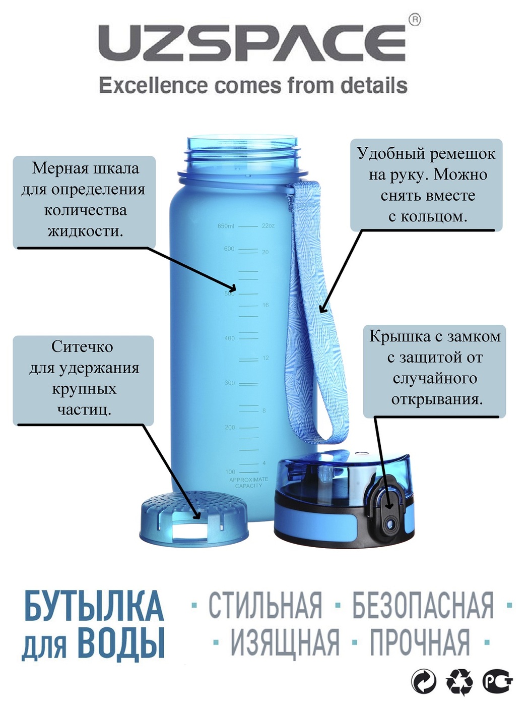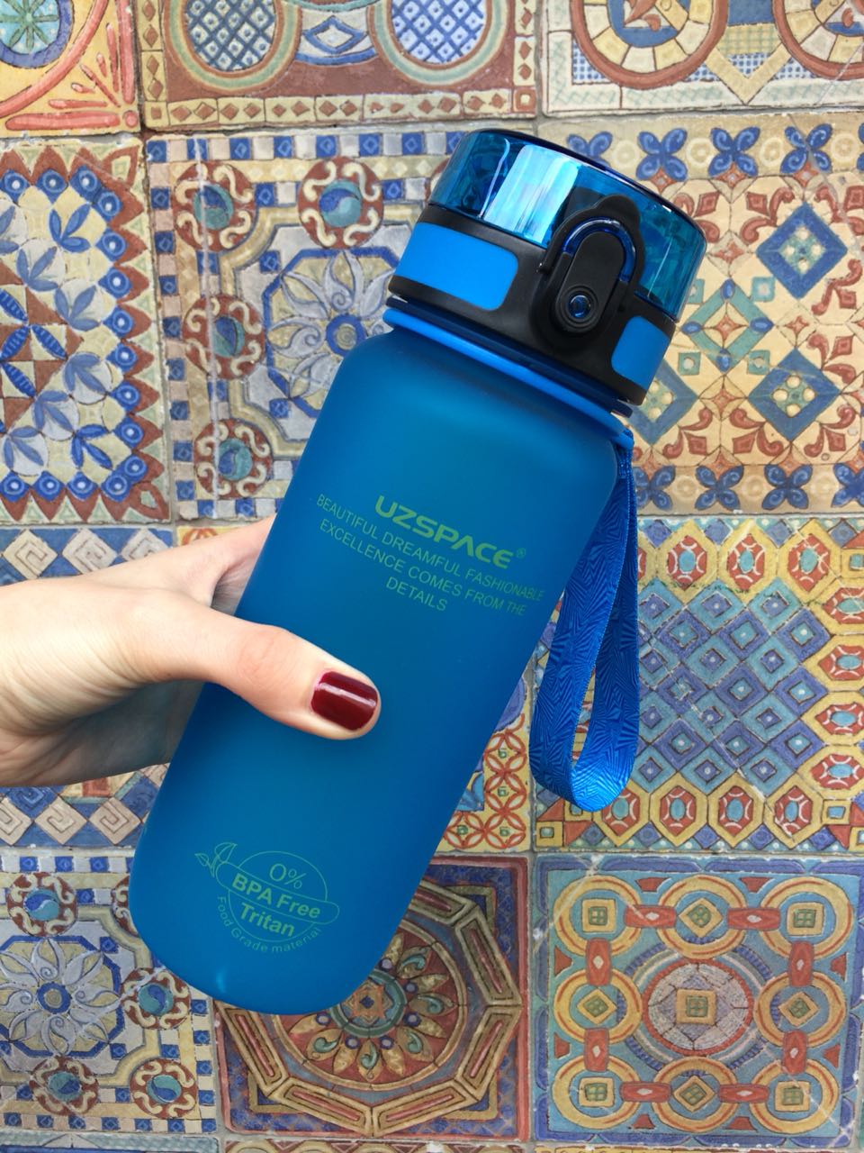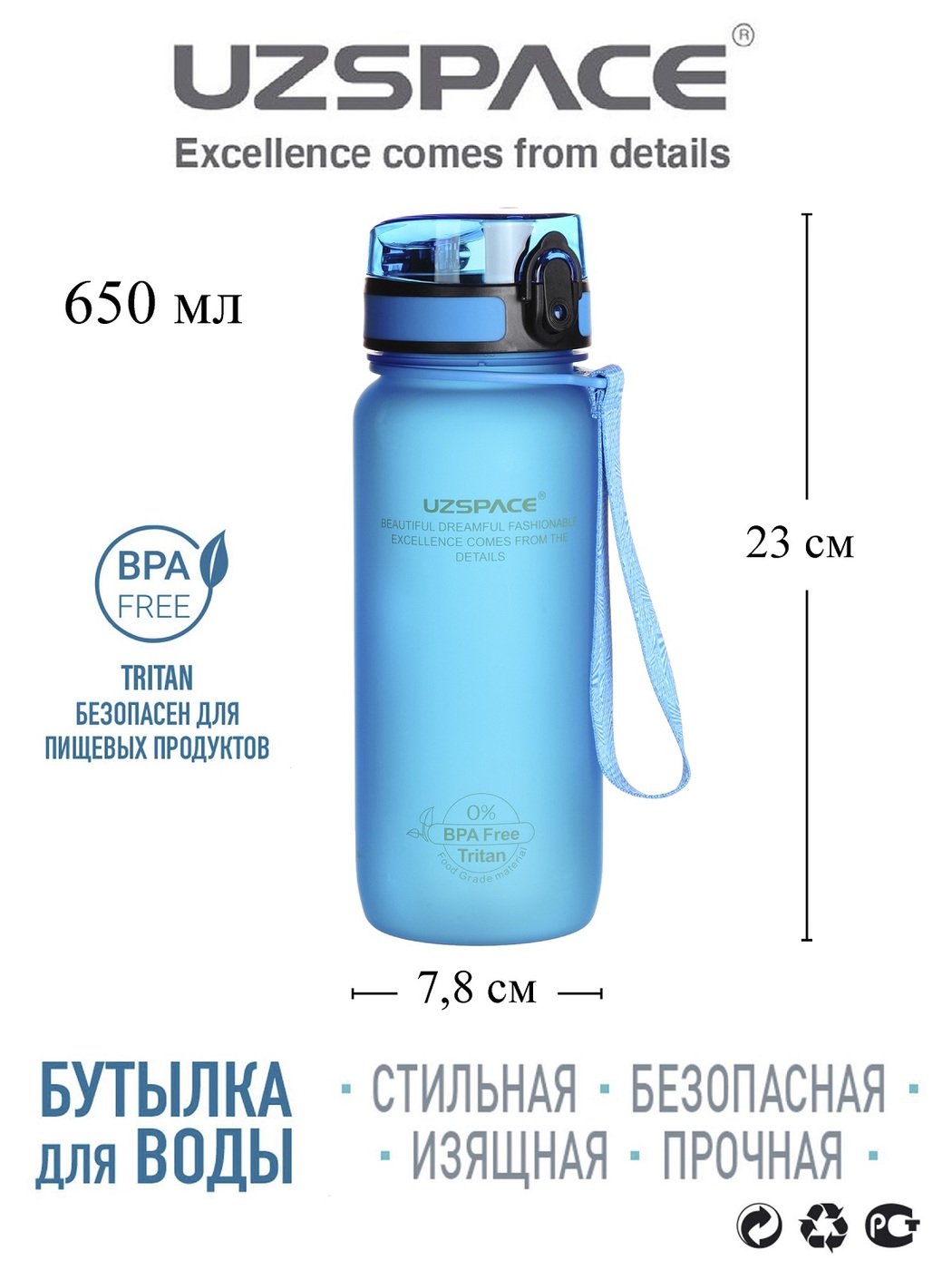 Туристическая бутылка для воды UZSPACE Colorful Frosted Series Button lid 650, синий
