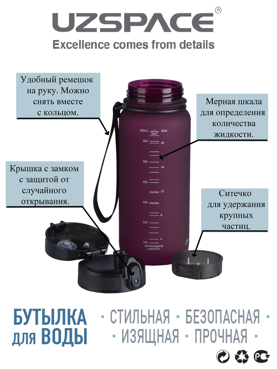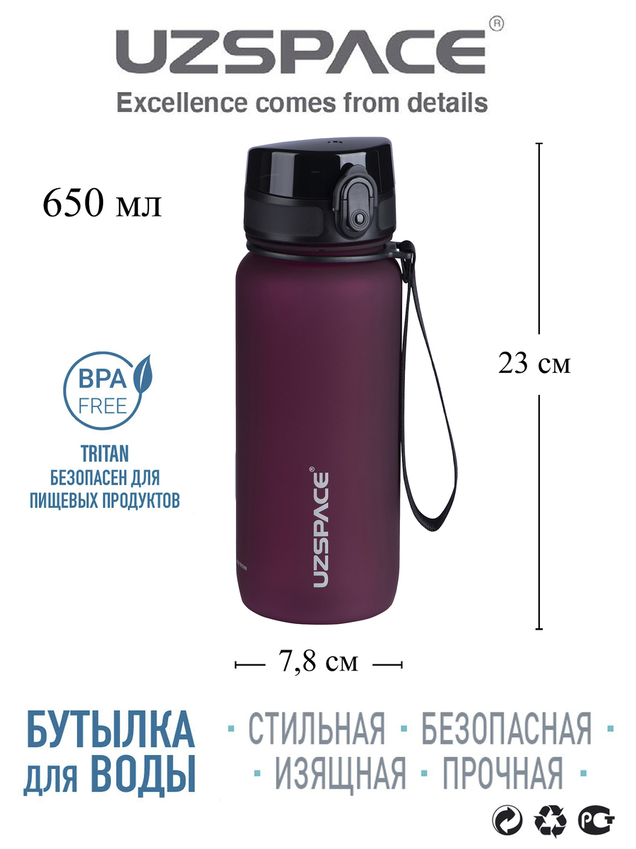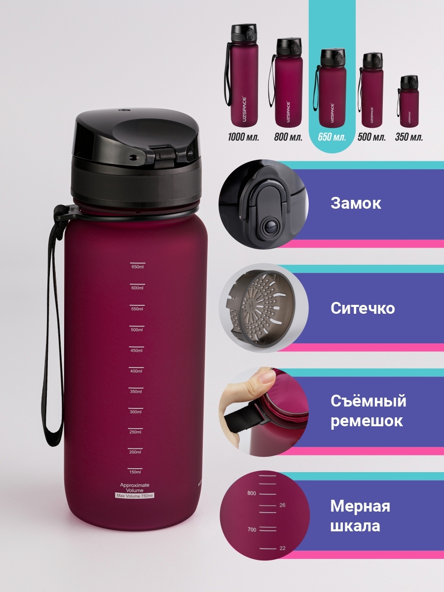 Спортивная бутылка, Colorful Frosted 650 UZSPACE, 650л., бордовый