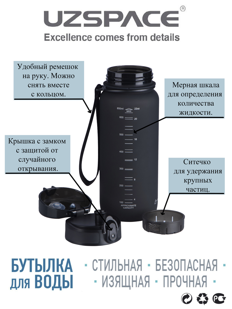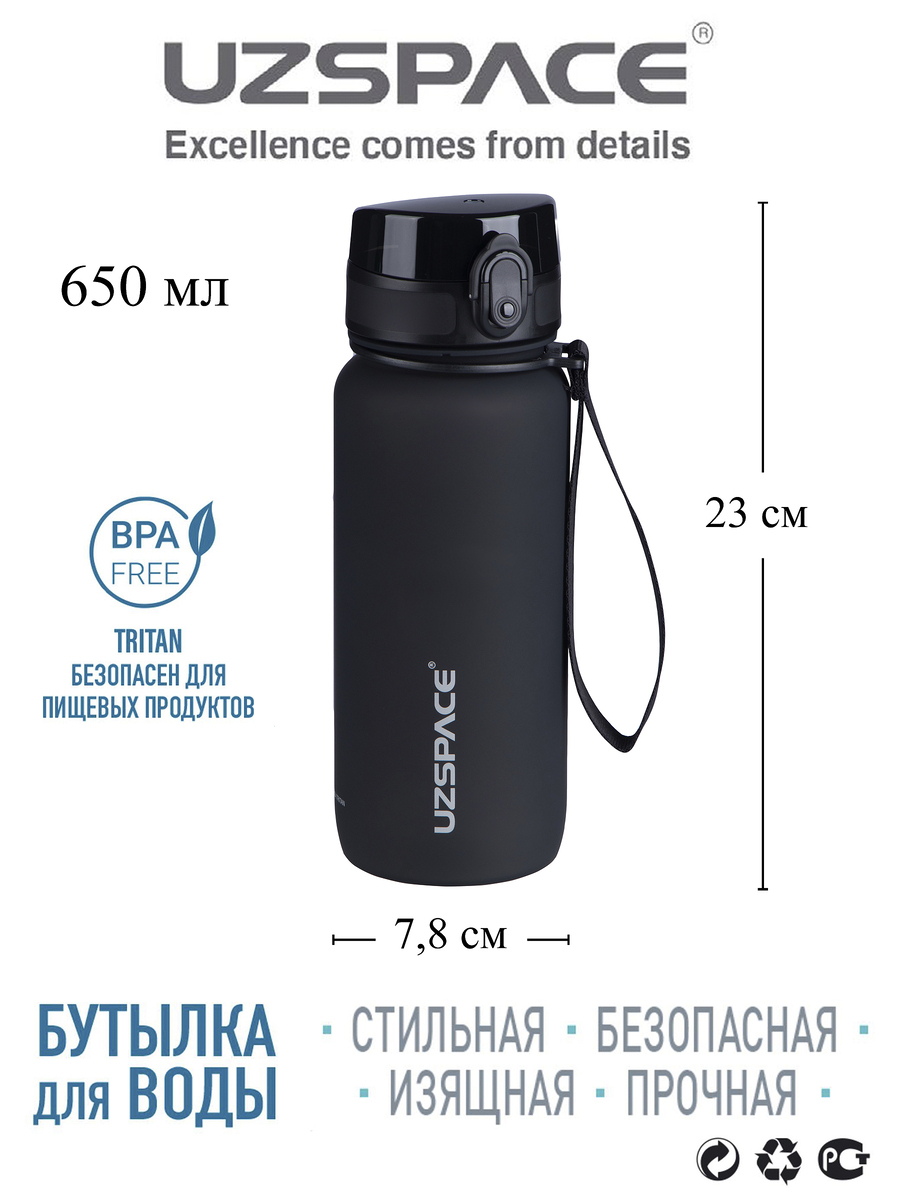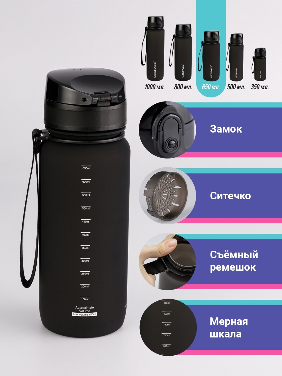 Спортивная бутылка, Colorful Frosted 650 UZSPACE, 650л., черный