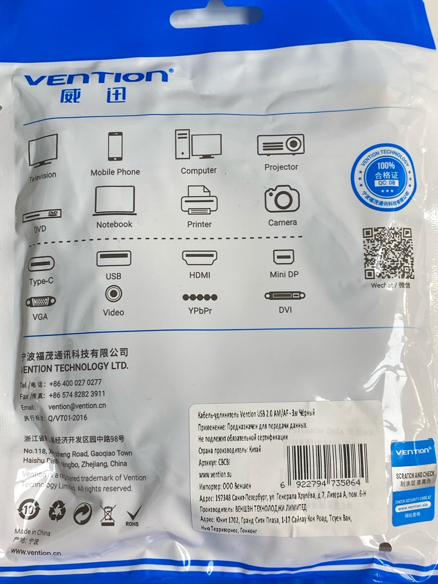 Кабель-удлинитель Vention USB 2.0 AM/AF - 3м Черный CBCBI