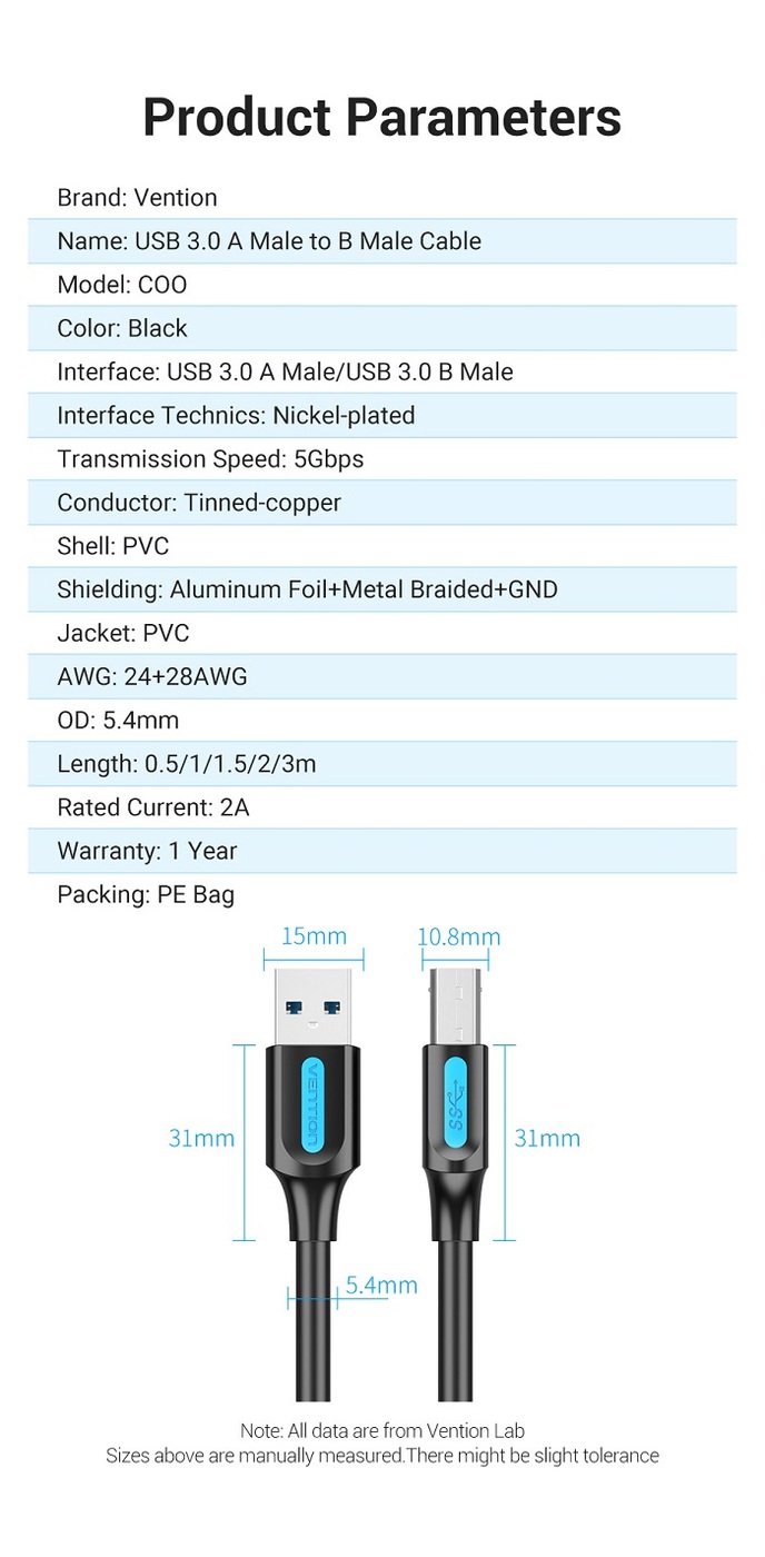 Кабель Vention USB 3.0 AM/BM - 3м COOBI