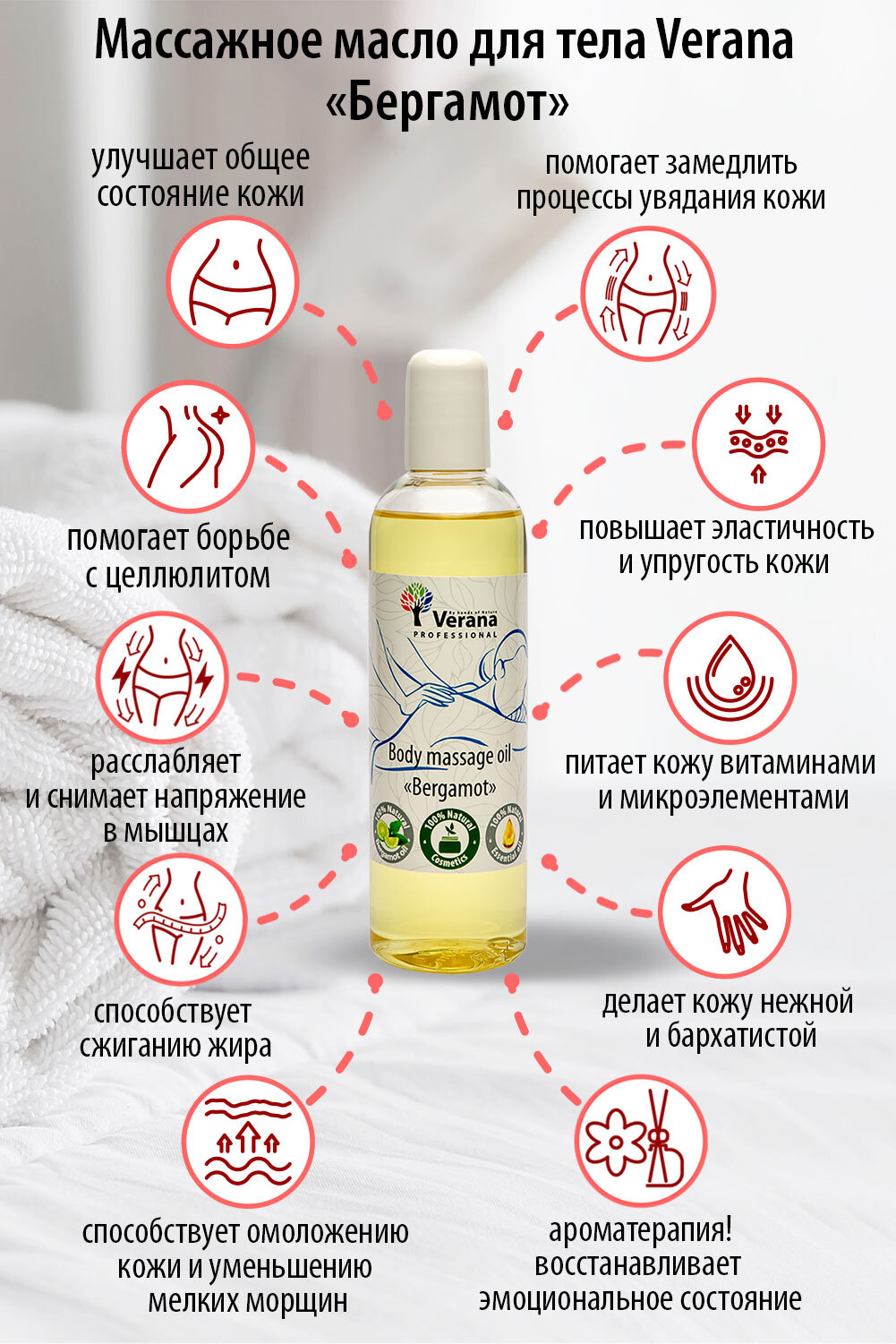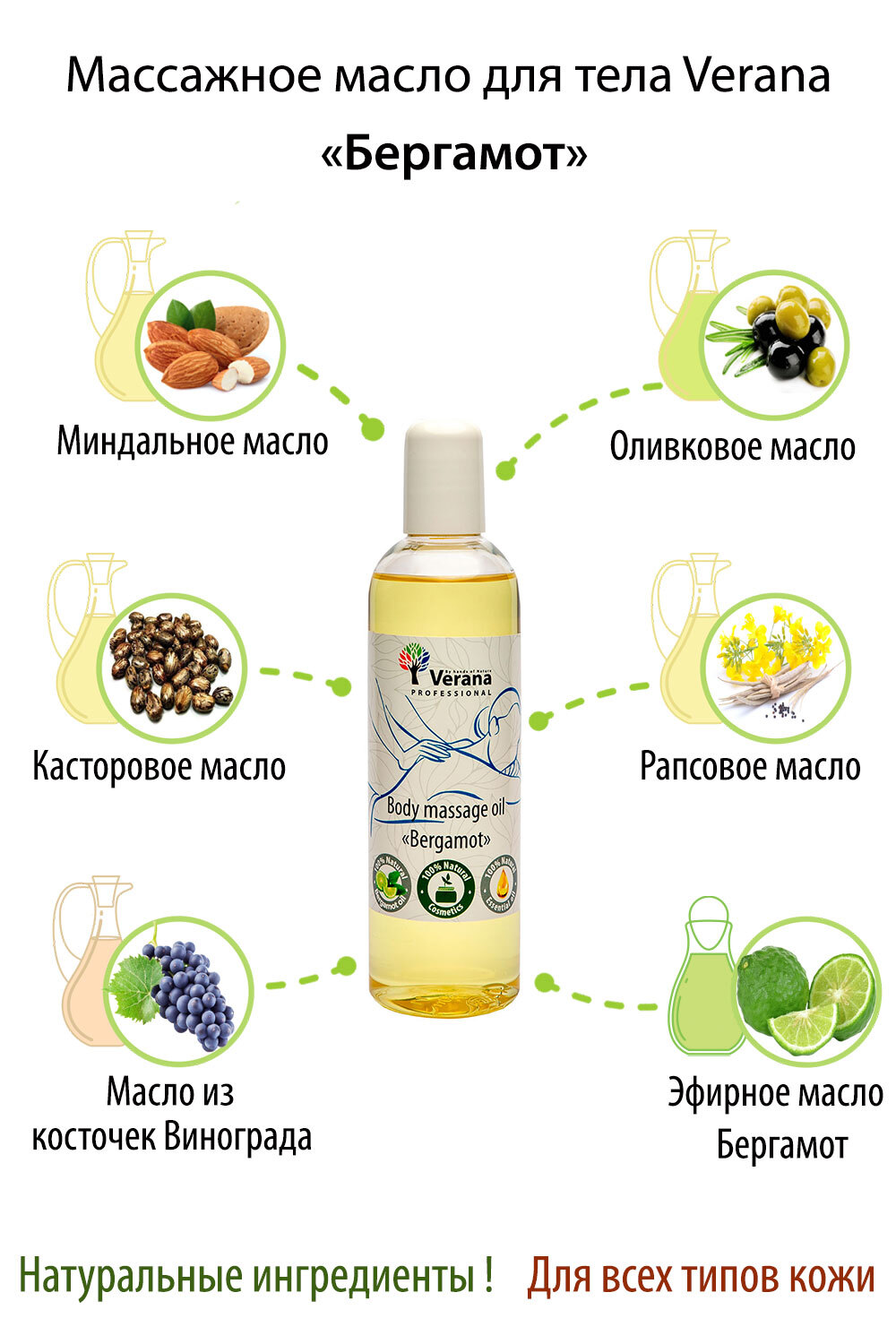 Verana Массажное масло для тела Бергамот, натуральное, антицеллюлитное, для похудения, омолаживающее, ароматерапия 1 л