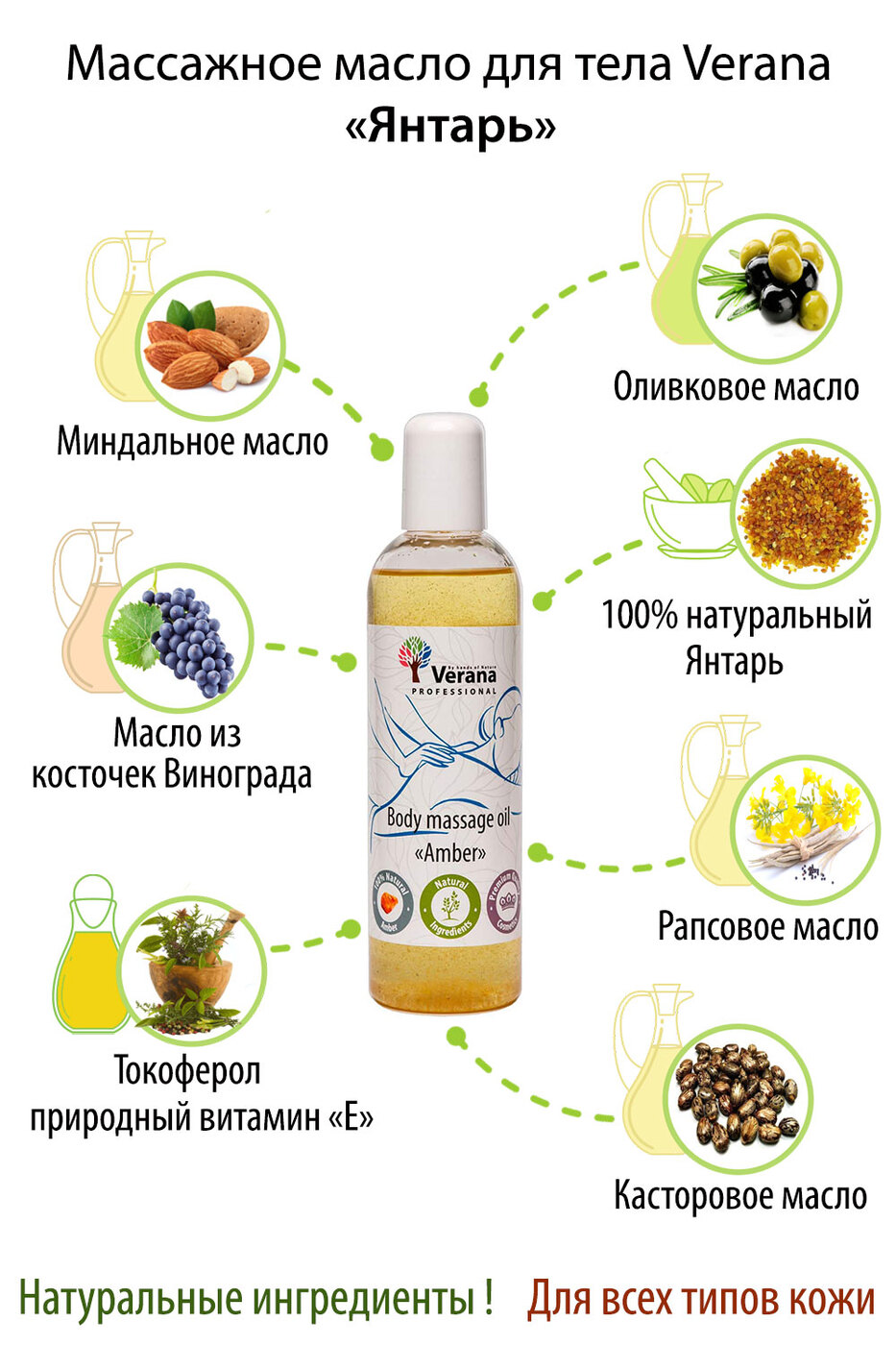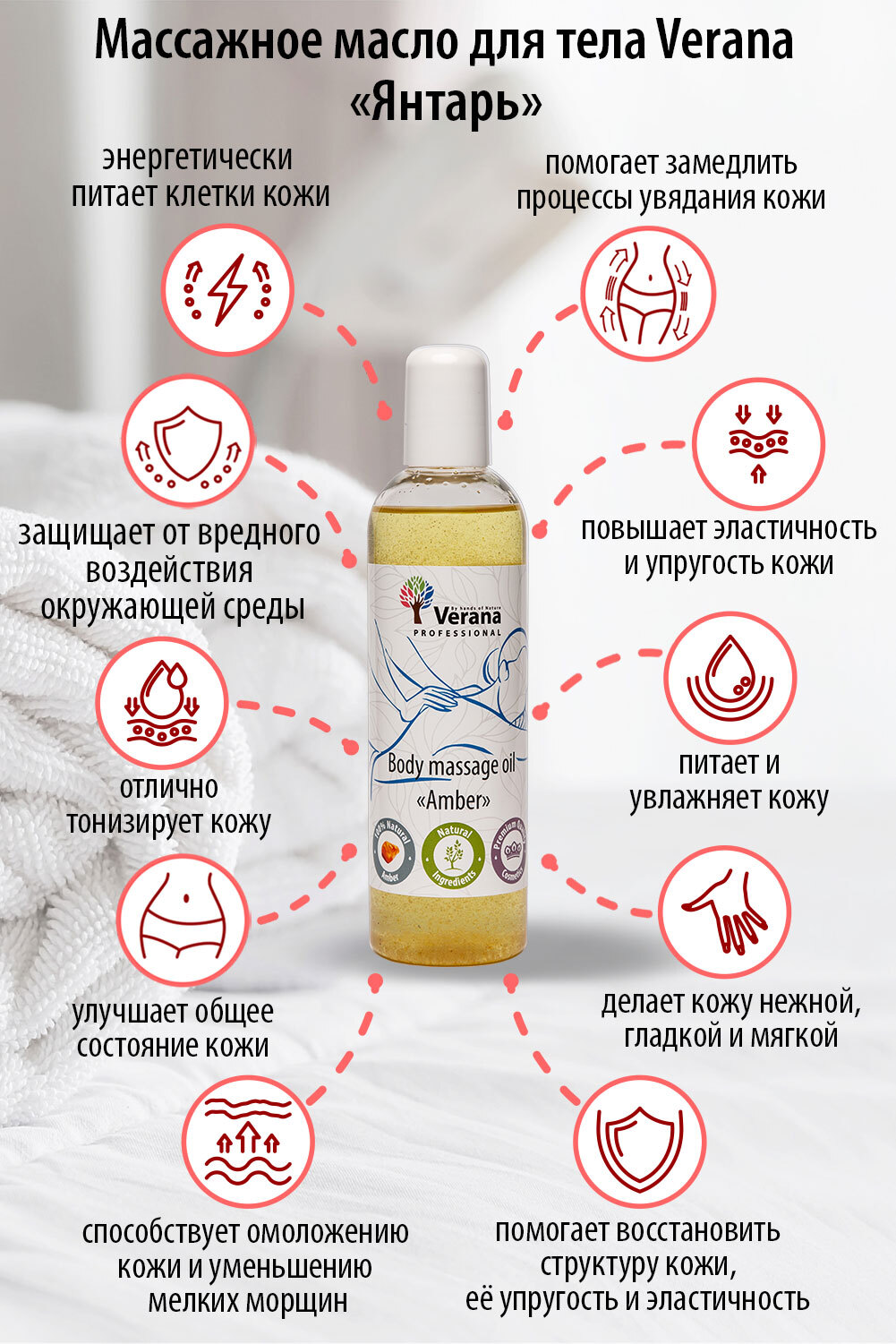Verana Массажное масло для тела Янтарь, натуральное, омолаживающее, восстанавливающее, ароматерапия 250 мл