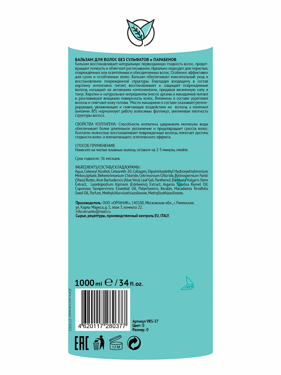 Бальзам-кондиционер восстанавливающий VERSANTO с экстрактом овса, вербены и вереска 200мл