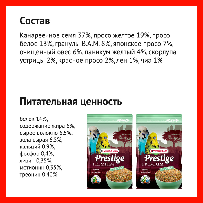 VERSELE-LAGA корм для волнистых попугаев Prestige PREMIUM Budgies 0,8 кг х 2 шт