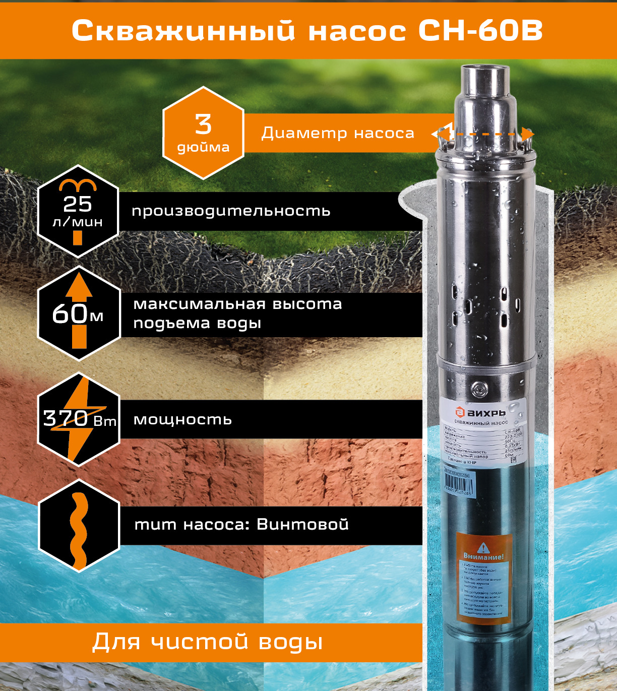 Скважинный насос СН-60B Вихрь, 60 м, 370 Вт