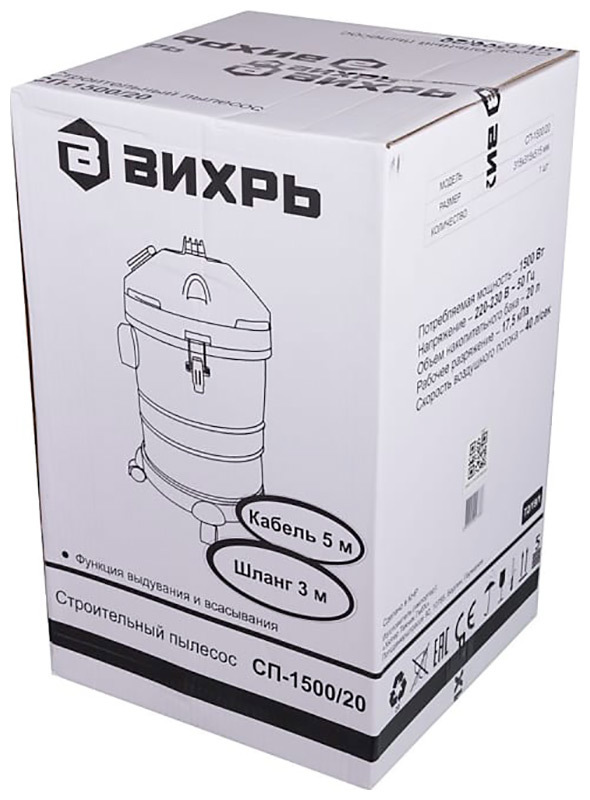 Строительный пылесос Вихрь ПС-1500/20 серый, 1500 Вт