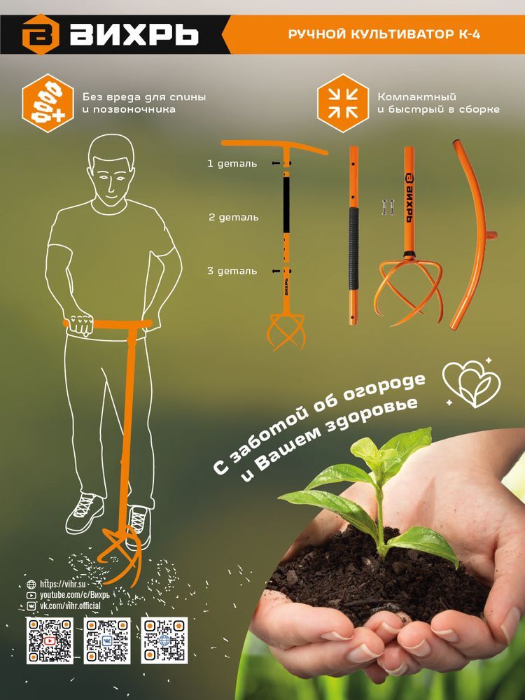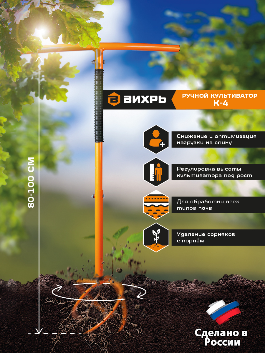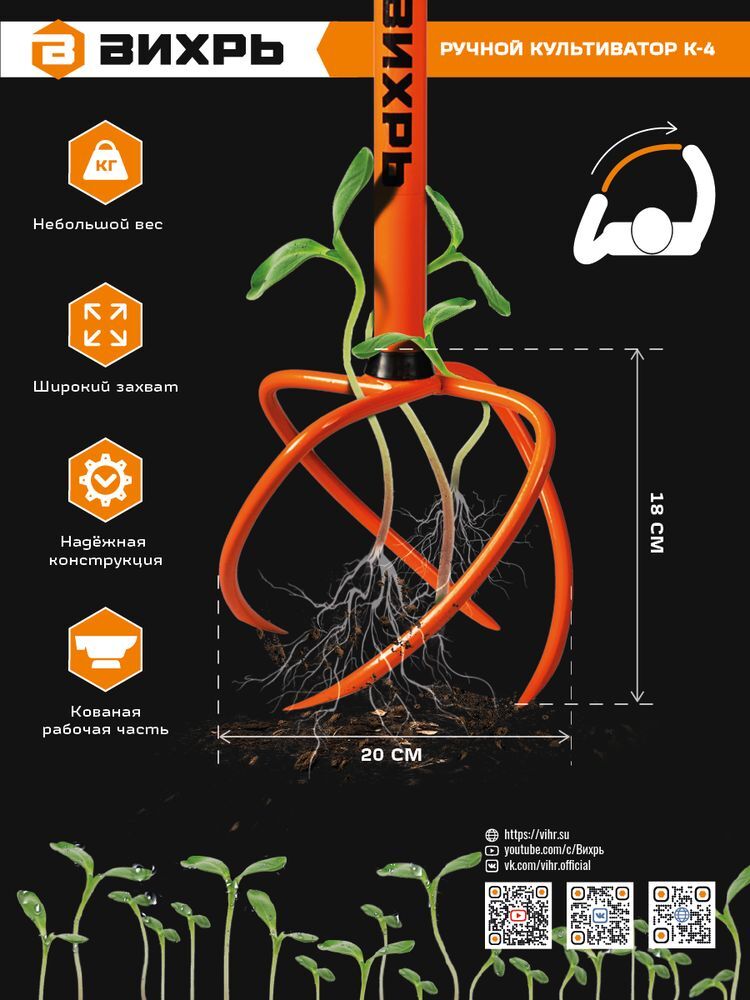 Ручной культиватор К-4, корнеудалитель, для разрыхления почвы любой плотности и устранения сорняков