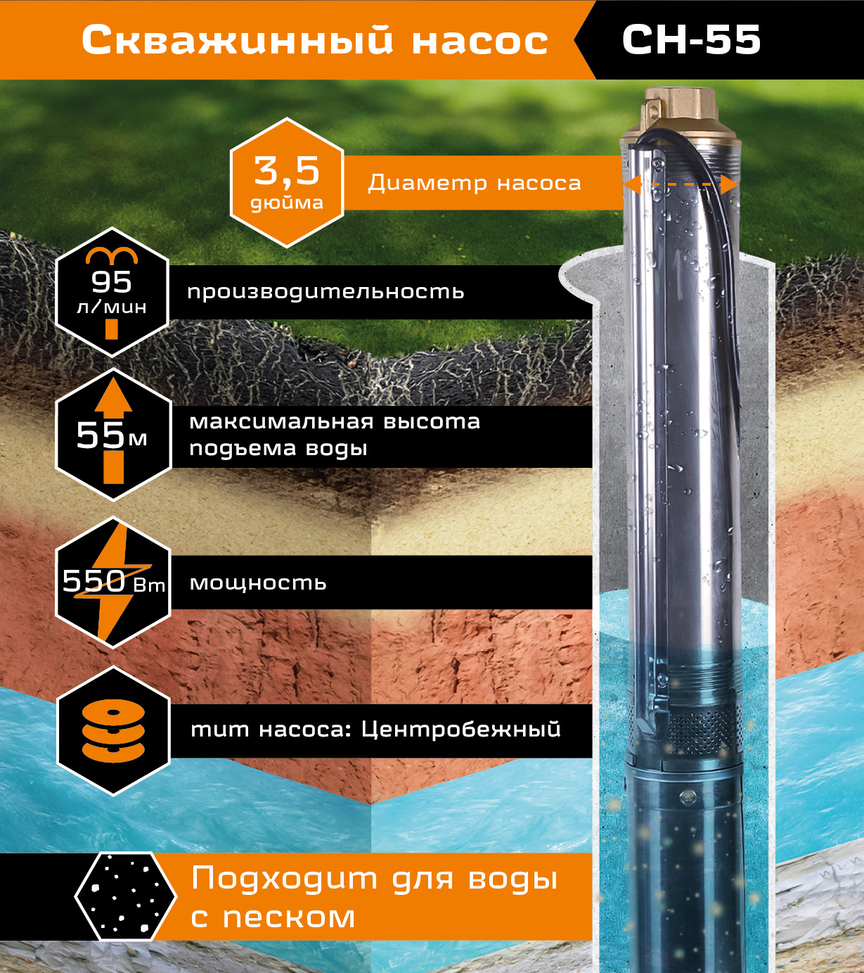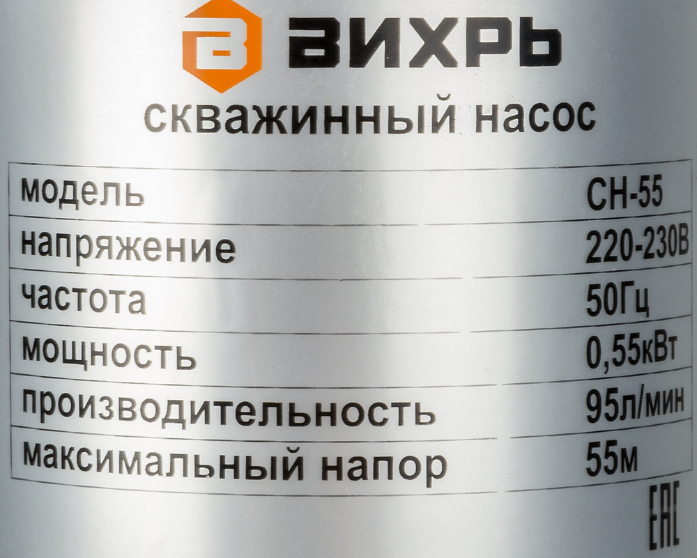 Садовый насос Вихрь СН-55, скважинный, 550 Вт, 3000 л/час, напор 55 м