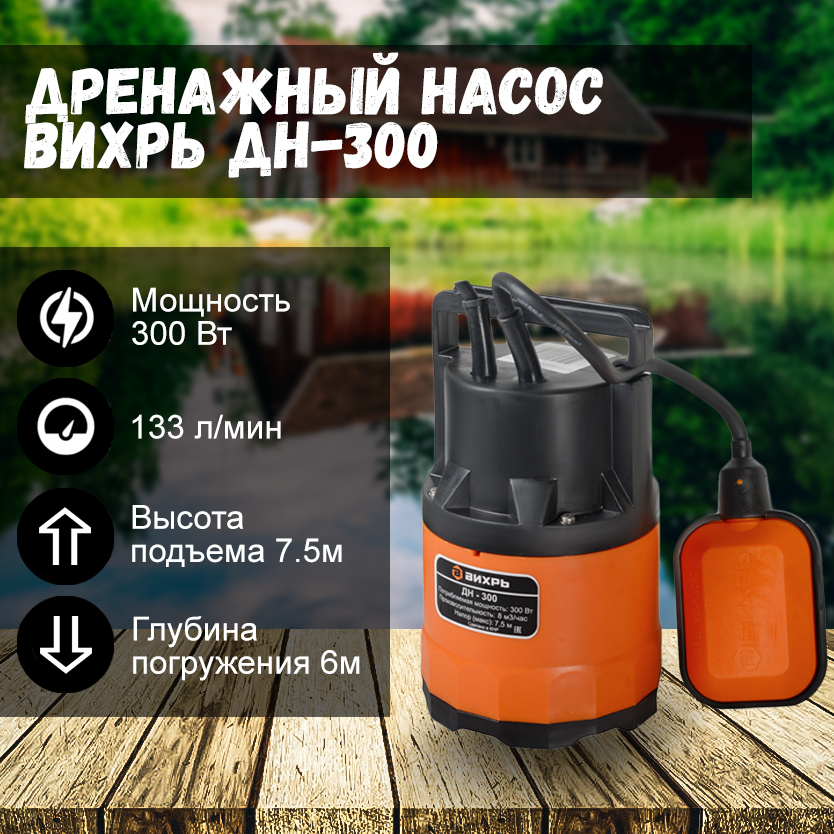 Садовый насос дренажный Вихрь ДН-350, 350 Вт, 8000 л/час, напор 5 м