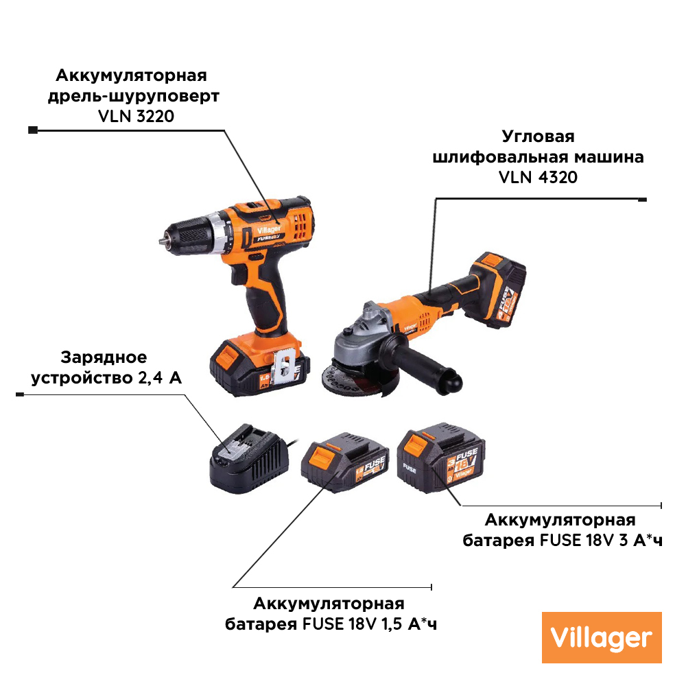 Набор аккумуляторного инструмента Villager FUZE / УШМ+ Шуруповерт