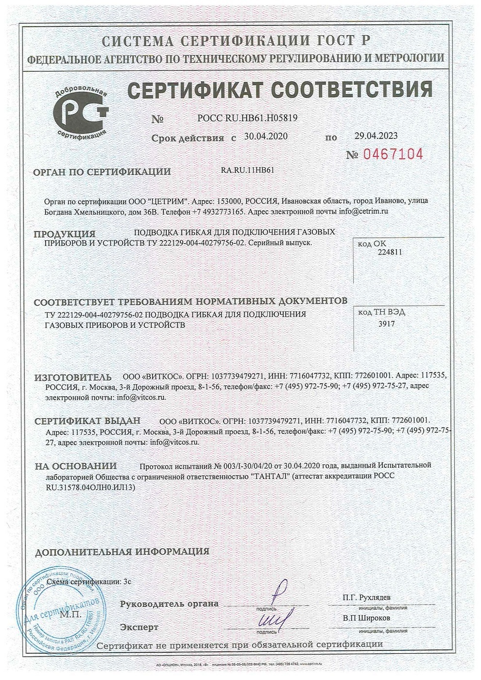 Шланг, подводка для газовых систем ВИТКОС 1,2м Гайка-гайка