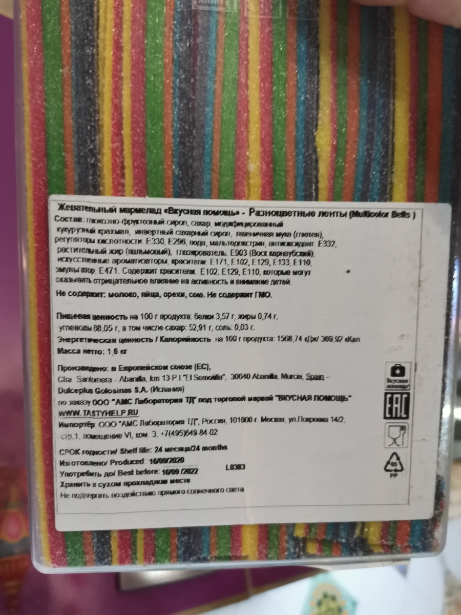 Вкусная помощь Жевательный мармелад Разноцветные ленты 1,6 кг в коробке