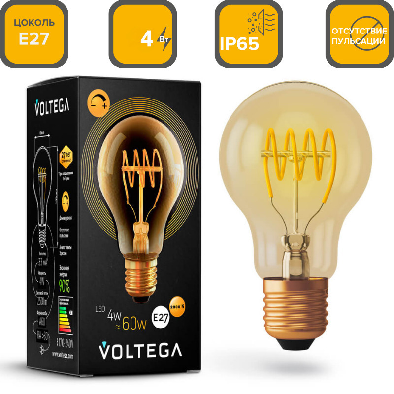 Лампочка Voltega 7019, Желтый свет, E27, 4 Вт, Светодиодная, 1 шт.