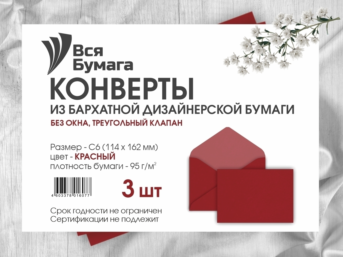 Конверт бархатный С6 (114-162 мм) флокированный, 3 шт., красный
