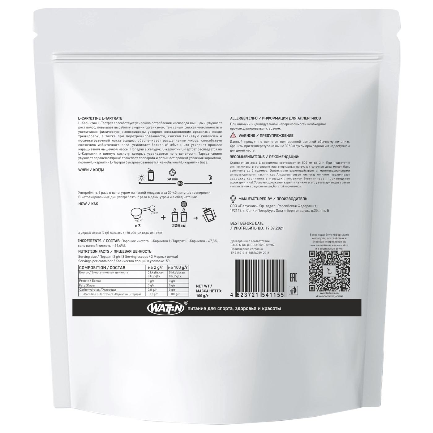 WATT NUTRITION, L-Карнитин (Тартрат) в порошке, 100 гр. Пакет
