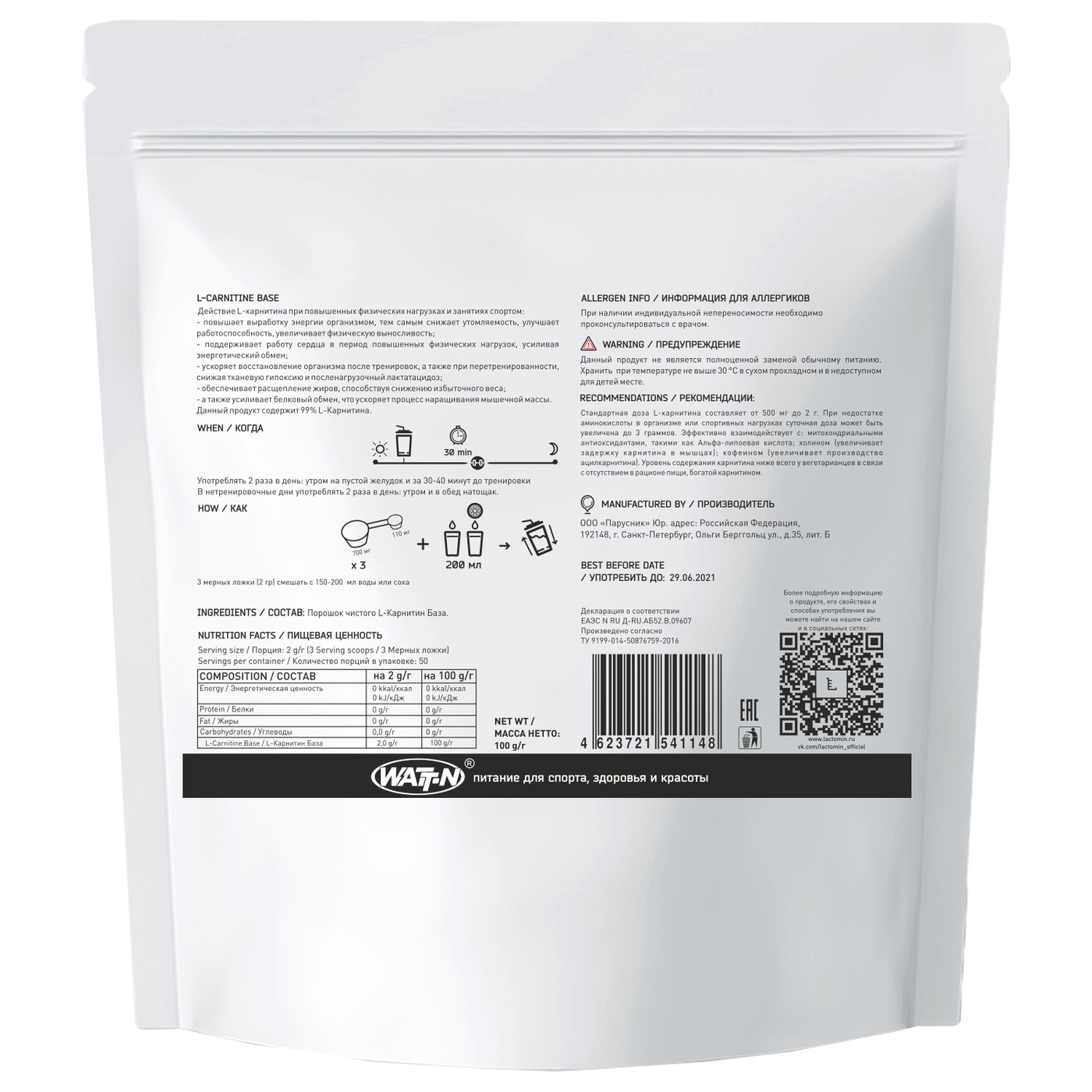 WATT NUTRITION, L-Карнитин, в порошке, 100 гр. Пакет
