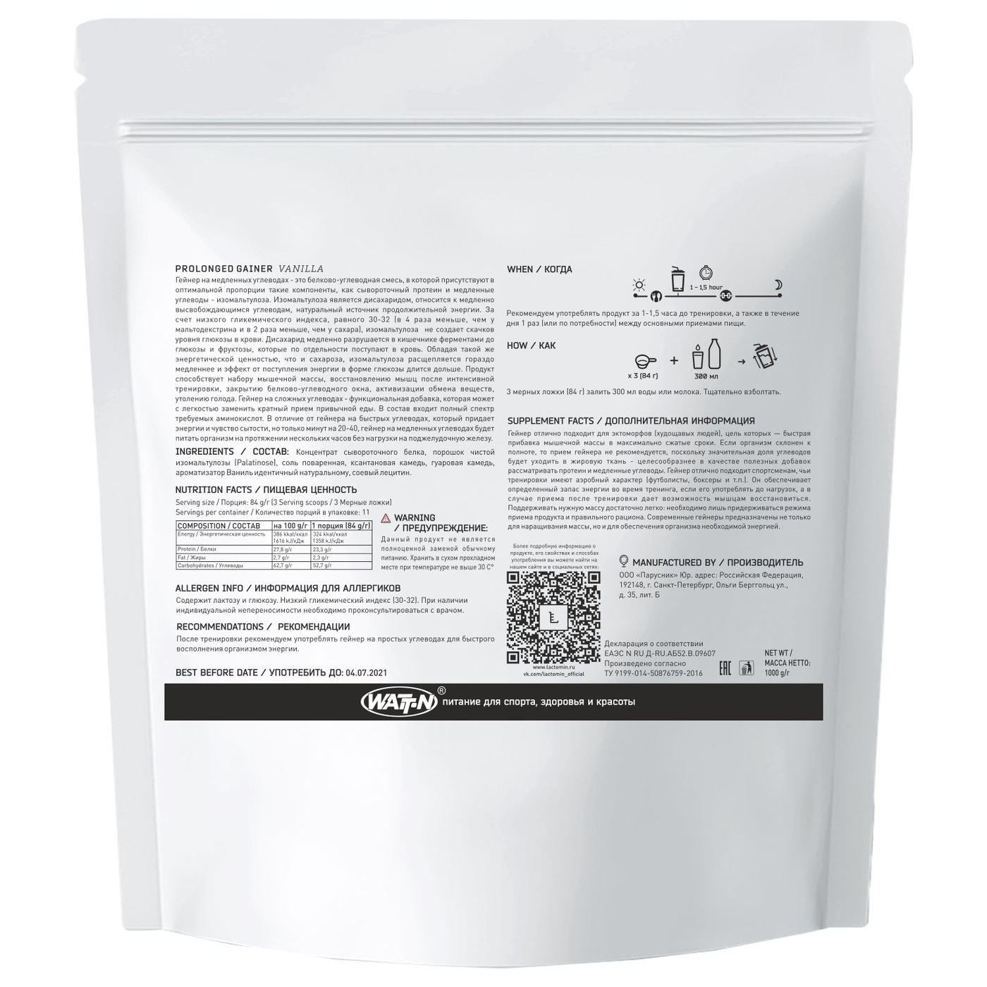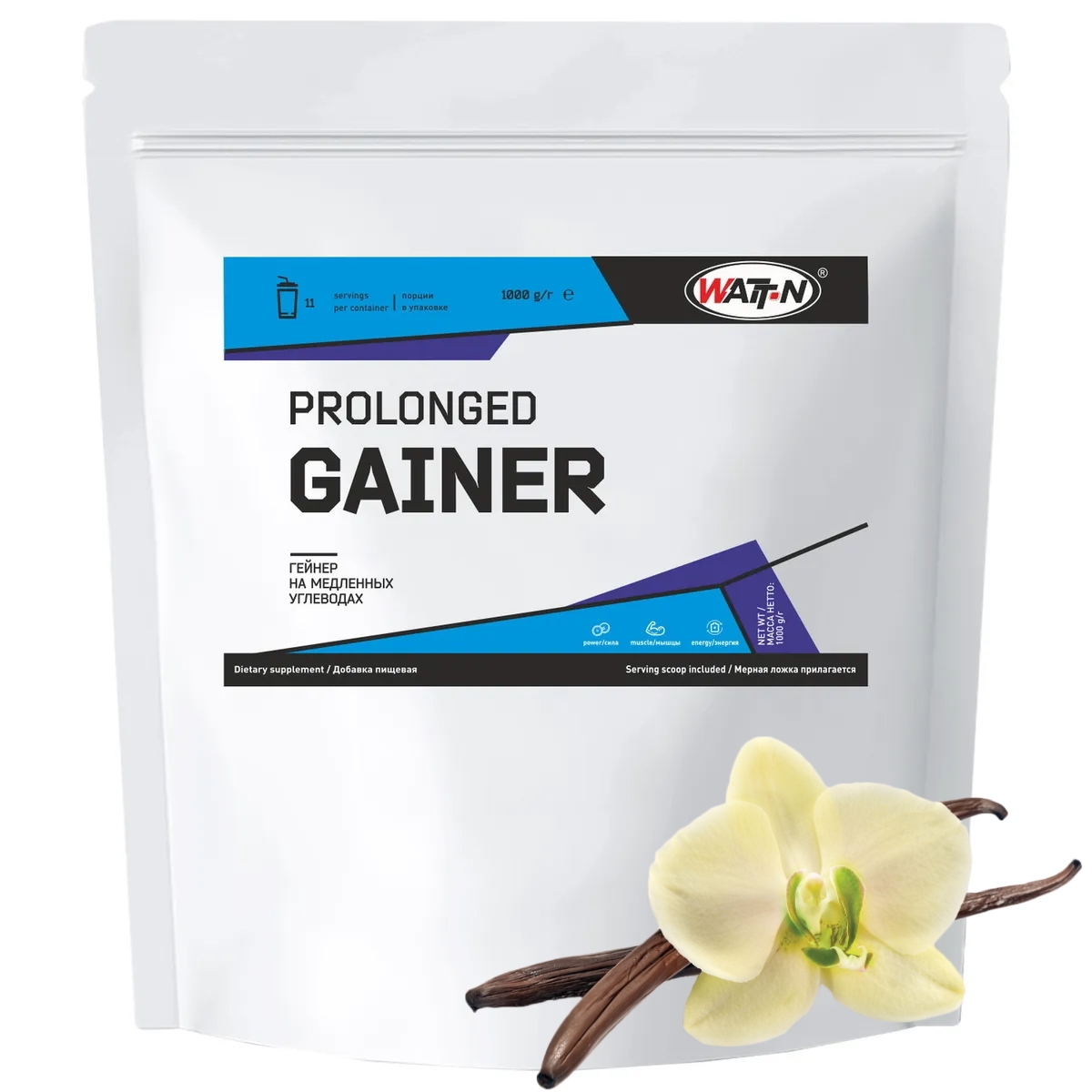 WATT NUTRITION, PROLONGED GAINER / Гейнер на медленных углеводах, 1000 гр. Ваниль
