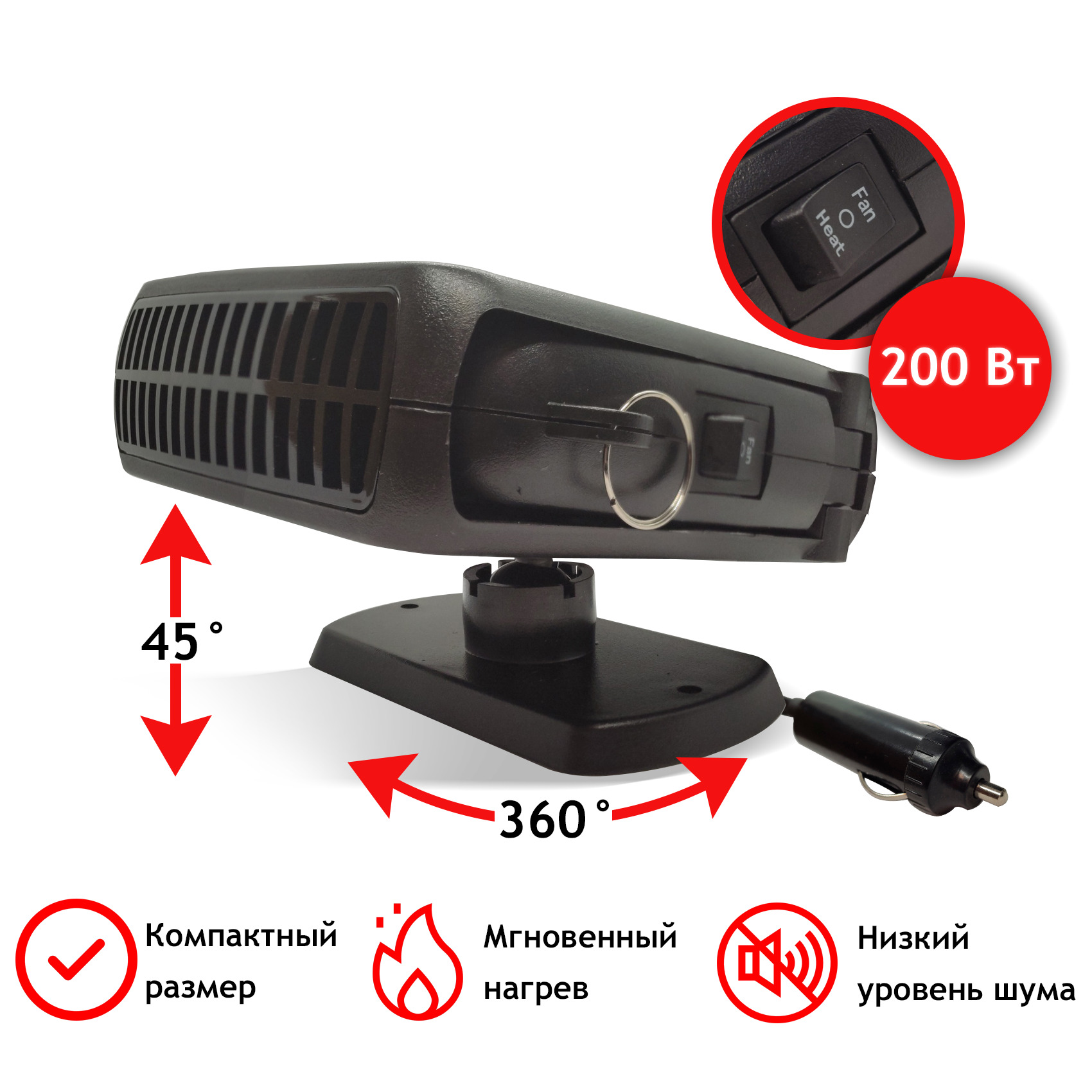 Тепловентилятор автомобильный, с керамическим нагревателем 12В, 200Вт