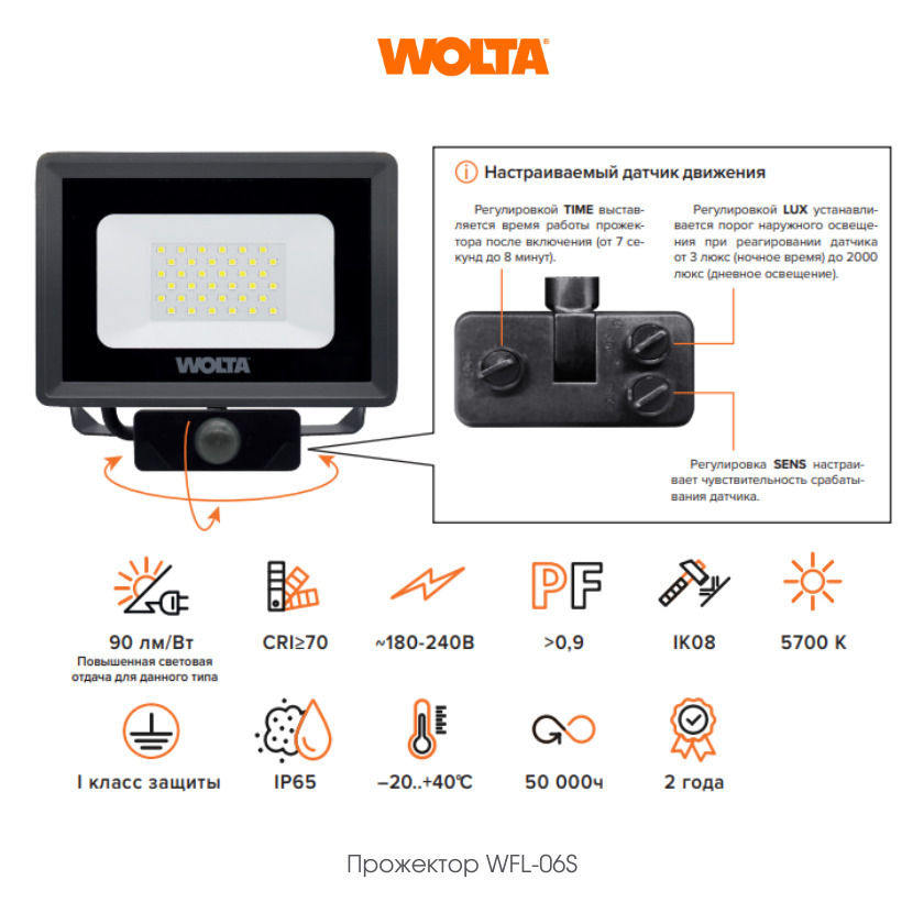 Прожектор Wolta, WFL sensor 5700 К, 30 Вт