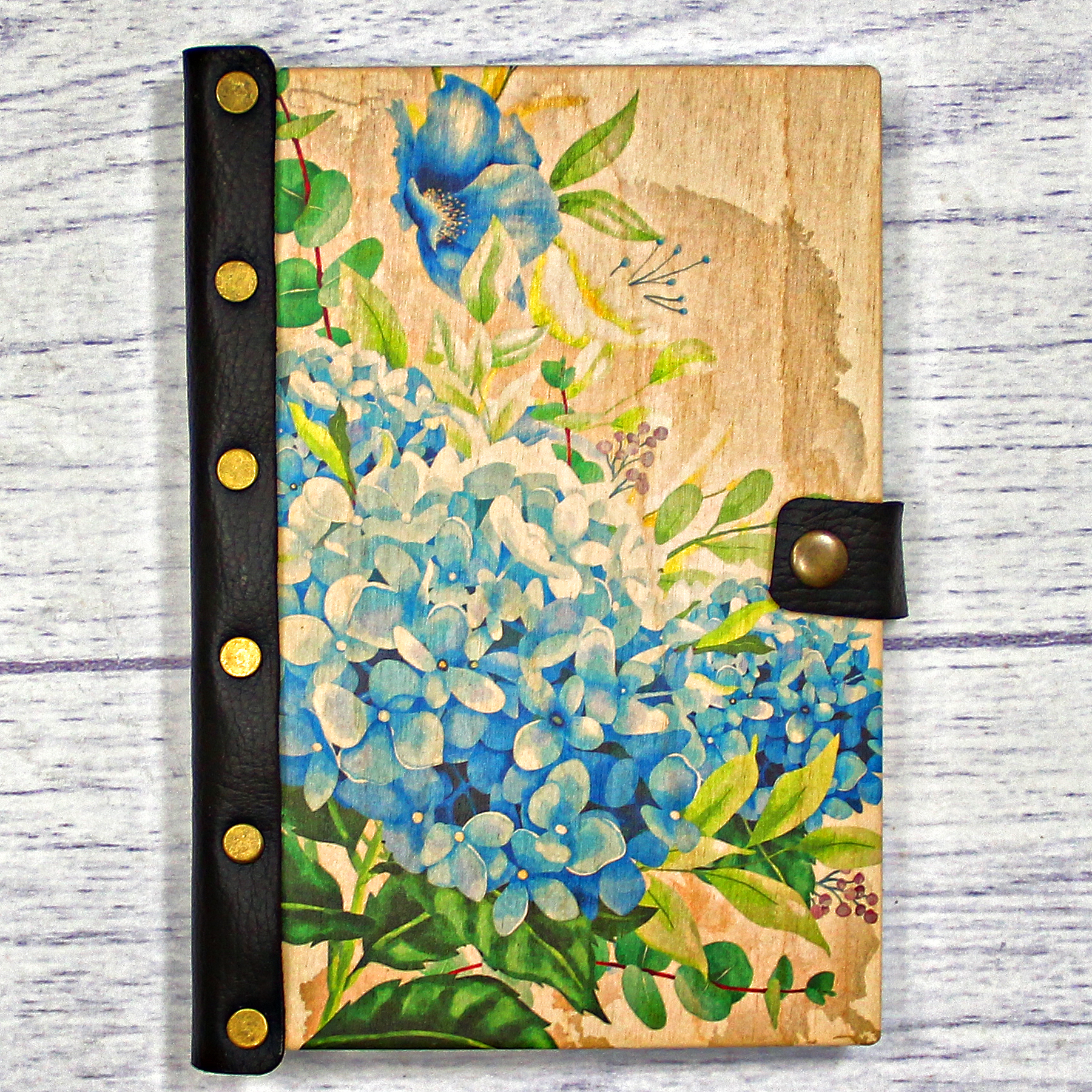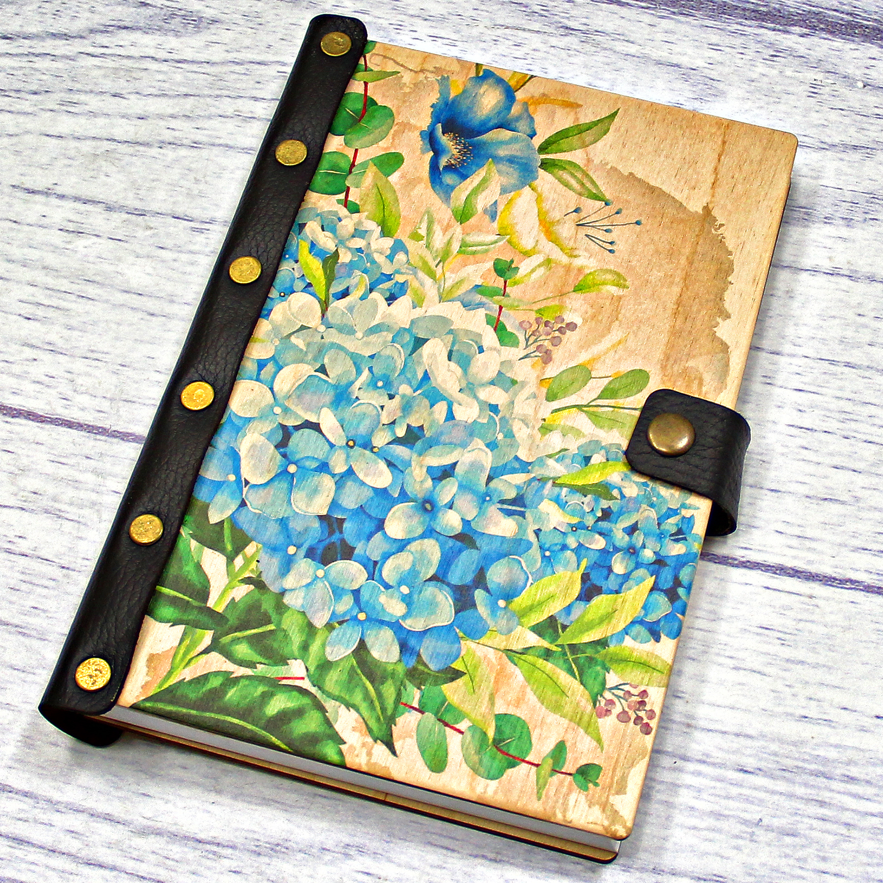 Деревянный ежедневник с принтом, "Голубая гортензия"
