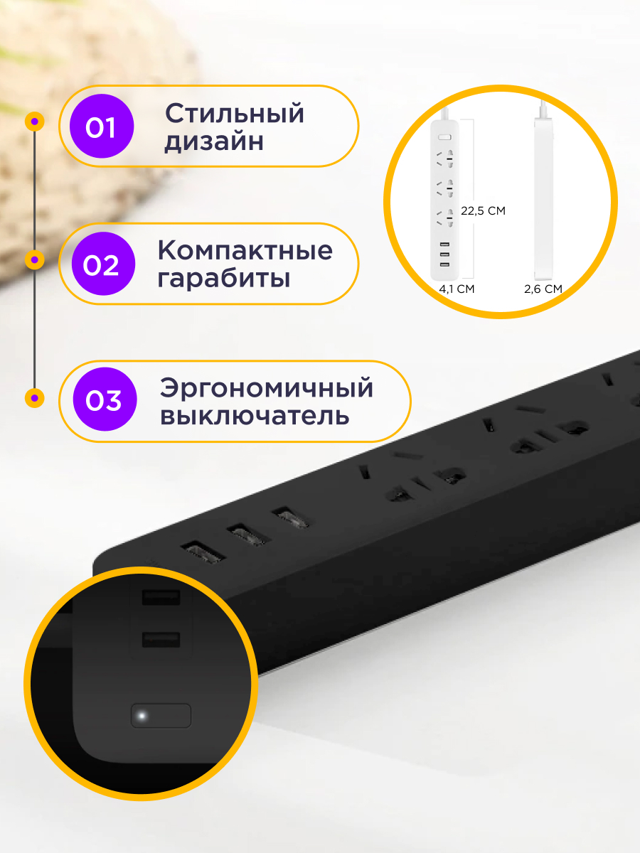 Удлинитель Xiaomi Mi Power Strip (3 розетки+3 USB)