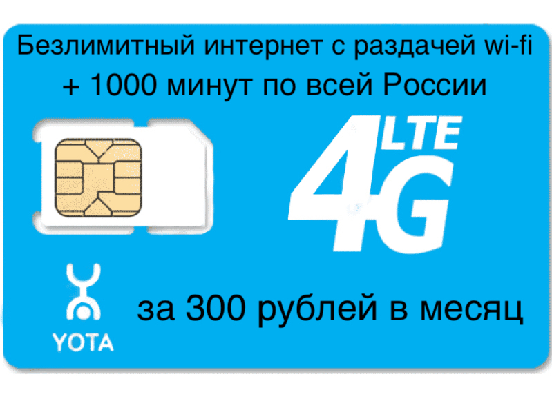 SIM-карта Yota 1000 минут и безлимитный интернет за 300 р/мес (Вся Россия)