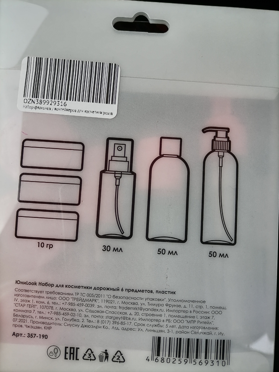 Набор контейнеров для косметики ЮниLook, дорожные флаконы 6 предметов, 2 цвета