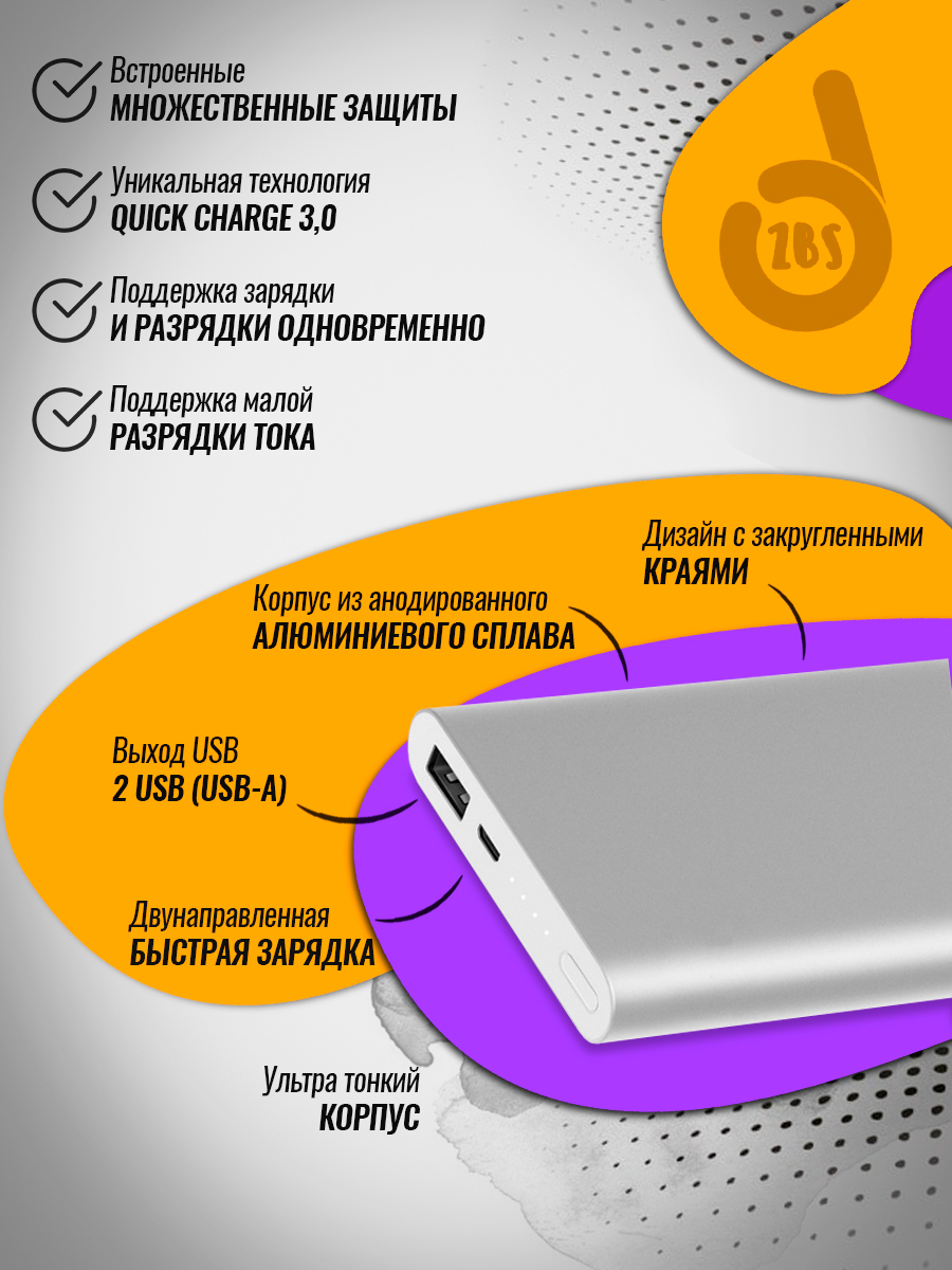 Повербанк / Powerbank / Внешний аккумулятор ZBS Power Bank 2, silver / Повербанк 10000mah