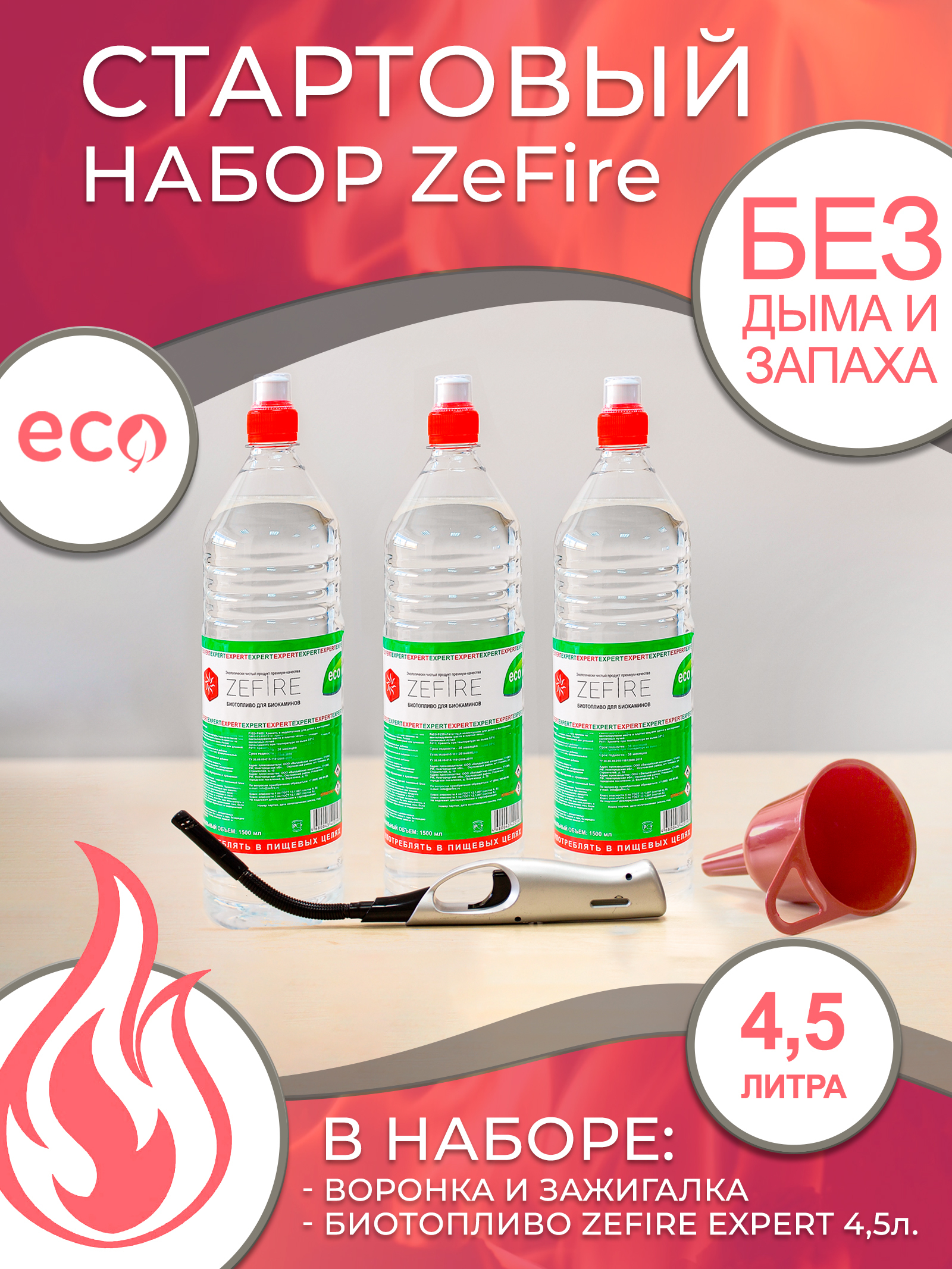 Стартовый набор ZeFire (Биотопливо ZeFire Expert 1,5 л - 3 шт., зажигалка, воронка)