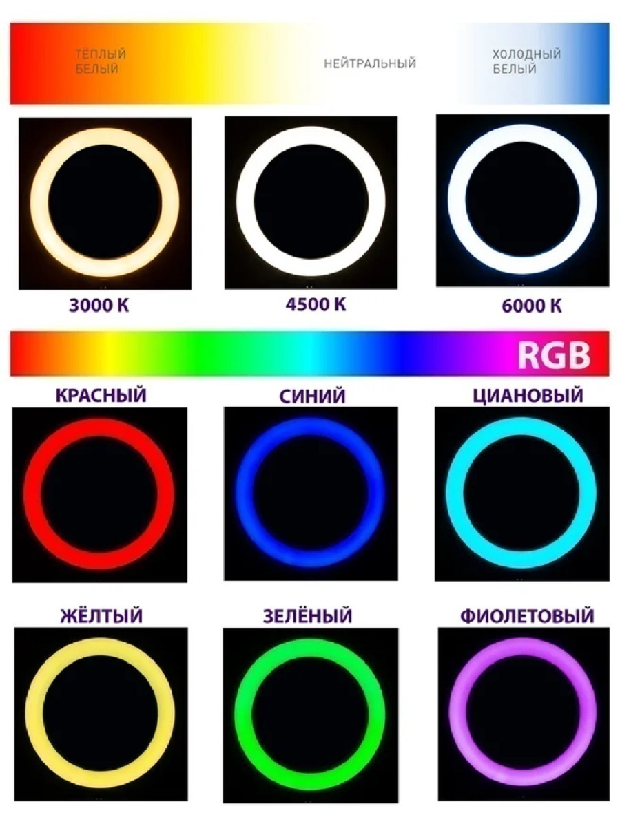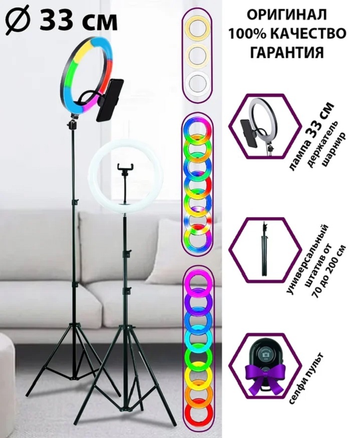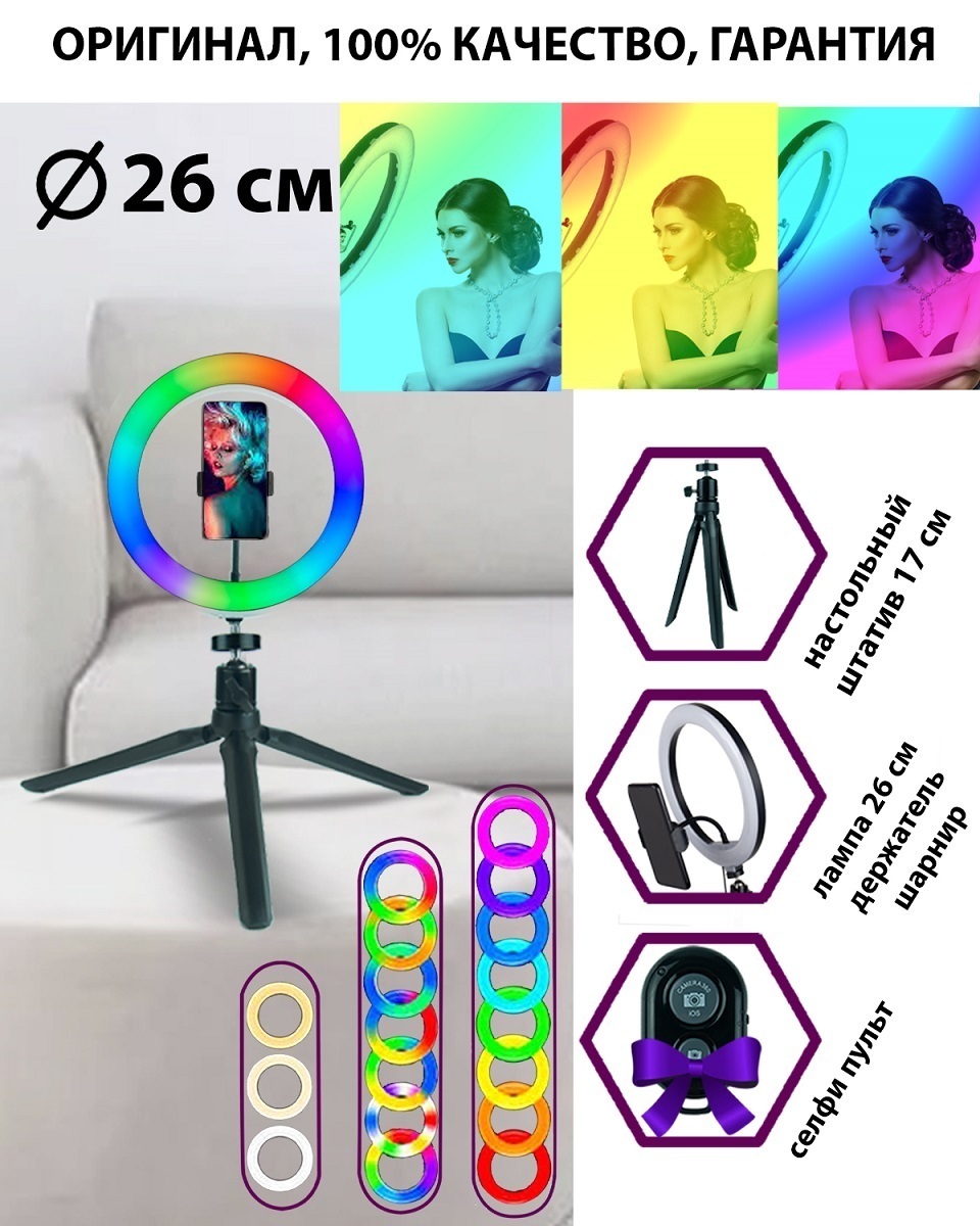 Цветная кольцевая лампа LED RGB zKissfashion 32 см со штативом держателем телефона селфи-пультом