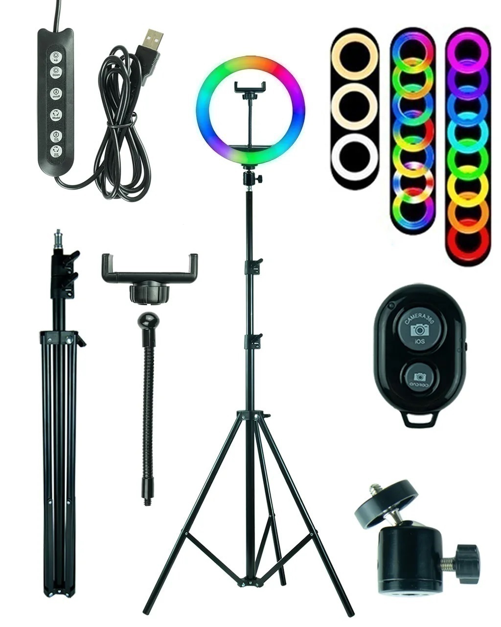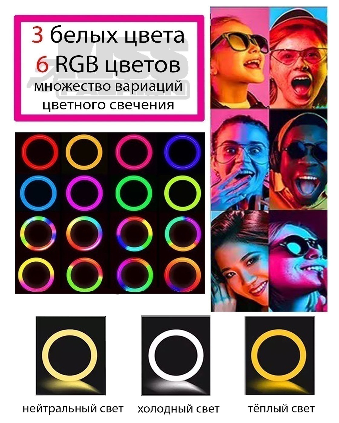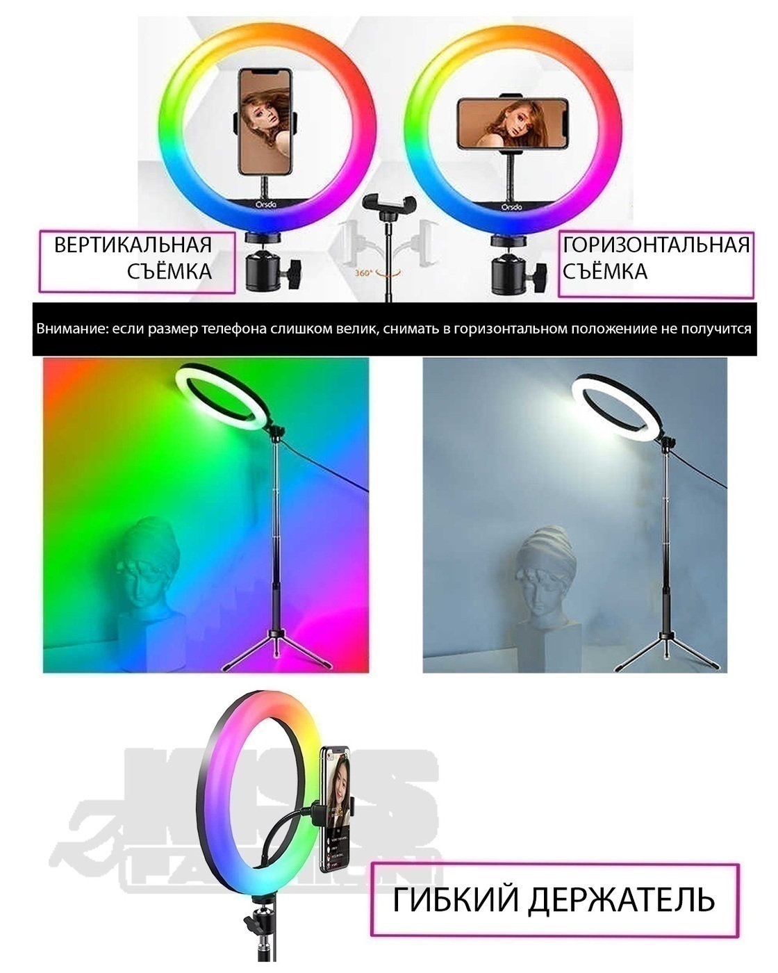 Кольцевая LED-лампа 26 см zKissfashion RGB цветная со штативом держателем для телефона и селфи-пультом. Модель 123267