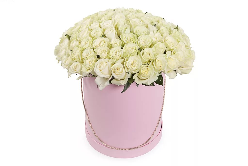 101 белая роза в корзине. Букет в корзине 101 роза 50 см. (Голландия)