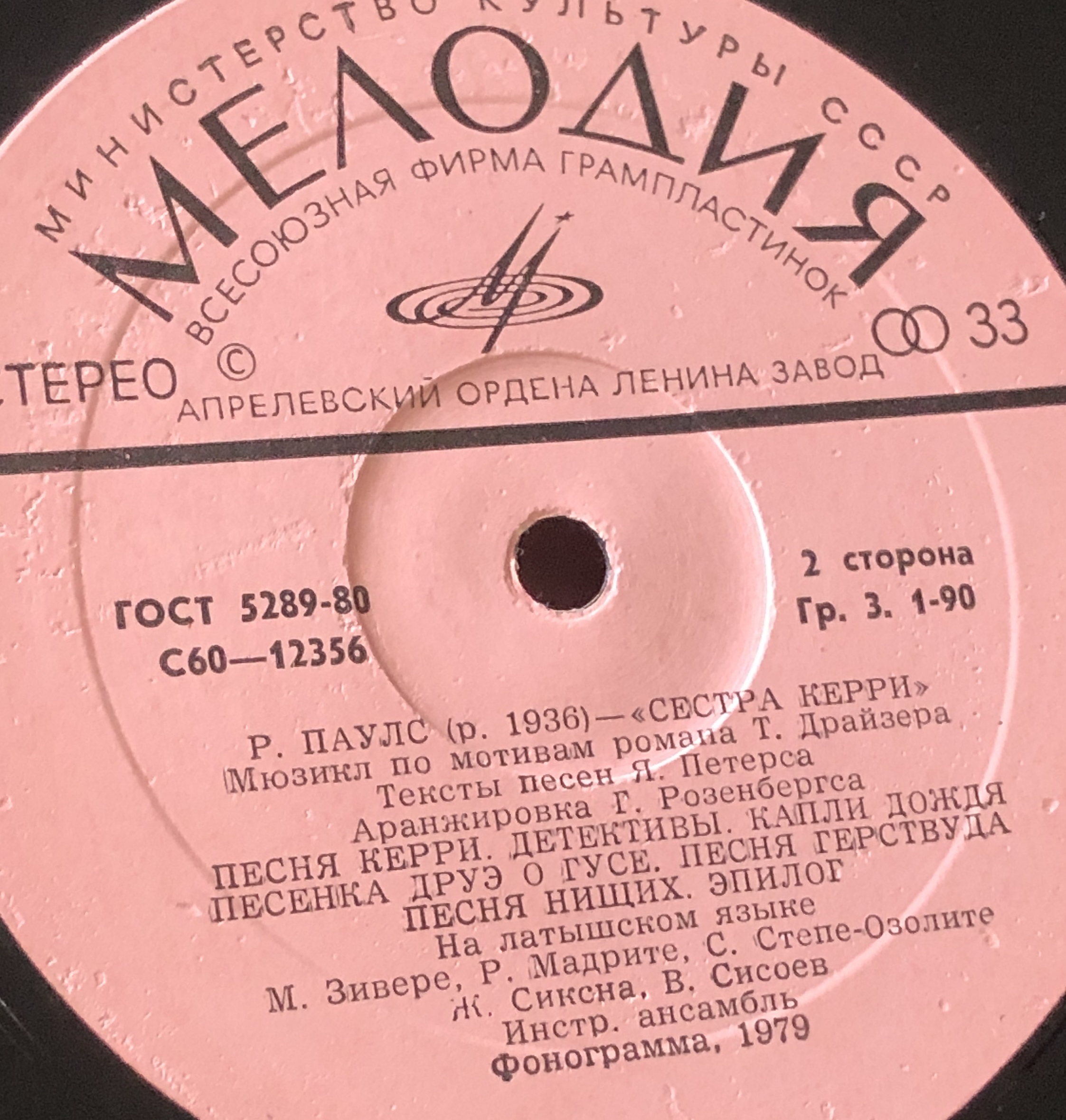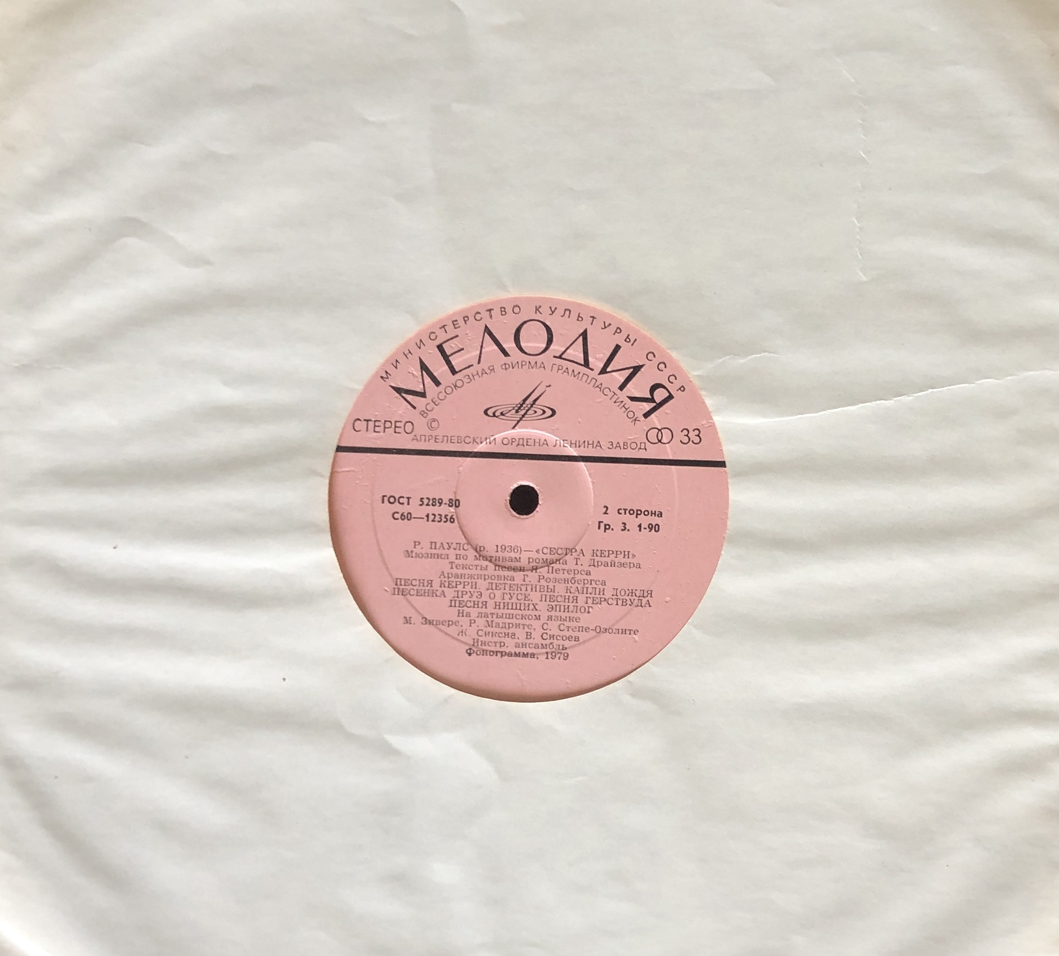 Виниловая пластинка Р. Паулс. Сестра Керри 300 мм
