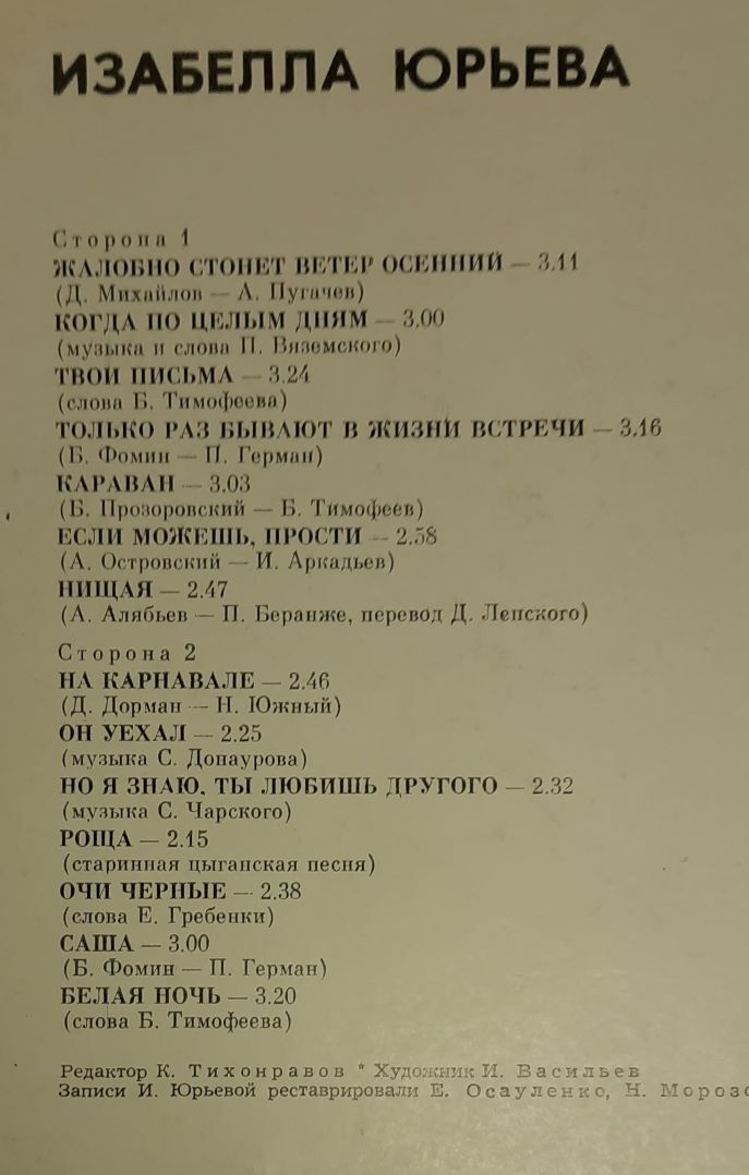 Пластинка виниловая "И. Юрьева. Старинны романсы и песни" 300 мм. (Сост. на фото)