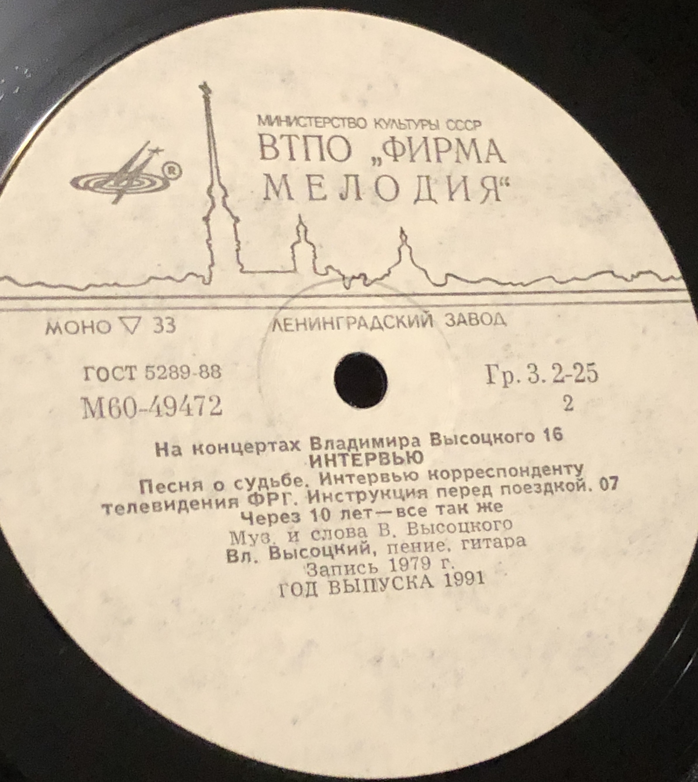 Виниловая пластинка Пластинка виниловая "На концертах Владимира Высоцкого 1" Мелодия 1987 300 мм.