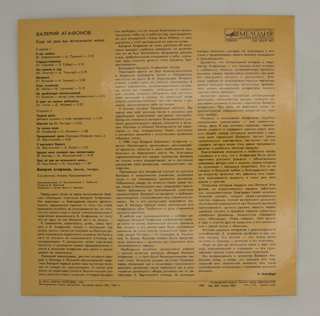 Виниловая пластинка Валерий Агафонов - Еще не раз вы вспомните меня... - LP