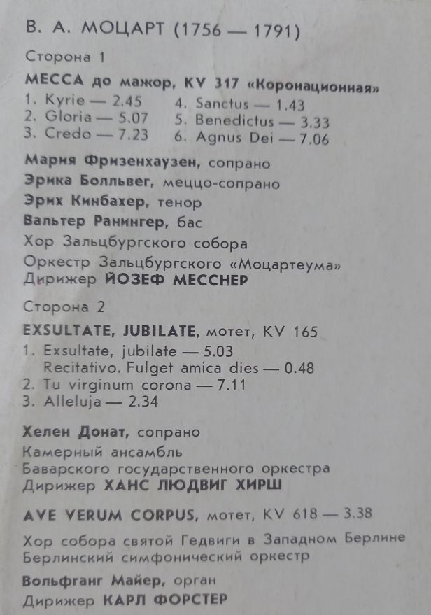 Пластинка виниловая "В. Моцарт. Missa C-dur kv 262,258" ETERNA 300 мм. (Сост. на фото)
