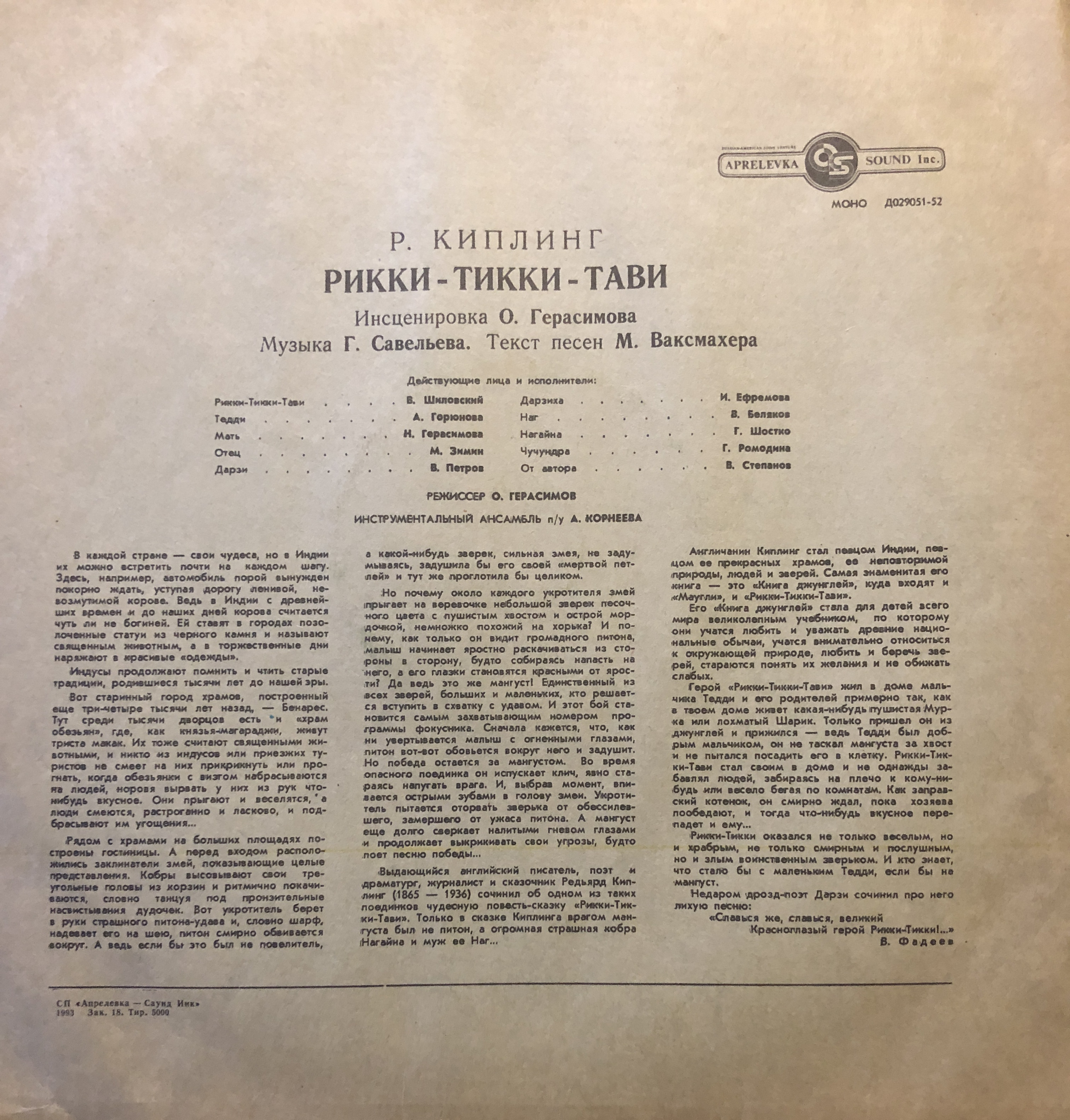 Виниловая пластинка Р. Киплинг Рикки-тикки-тави 300 мм