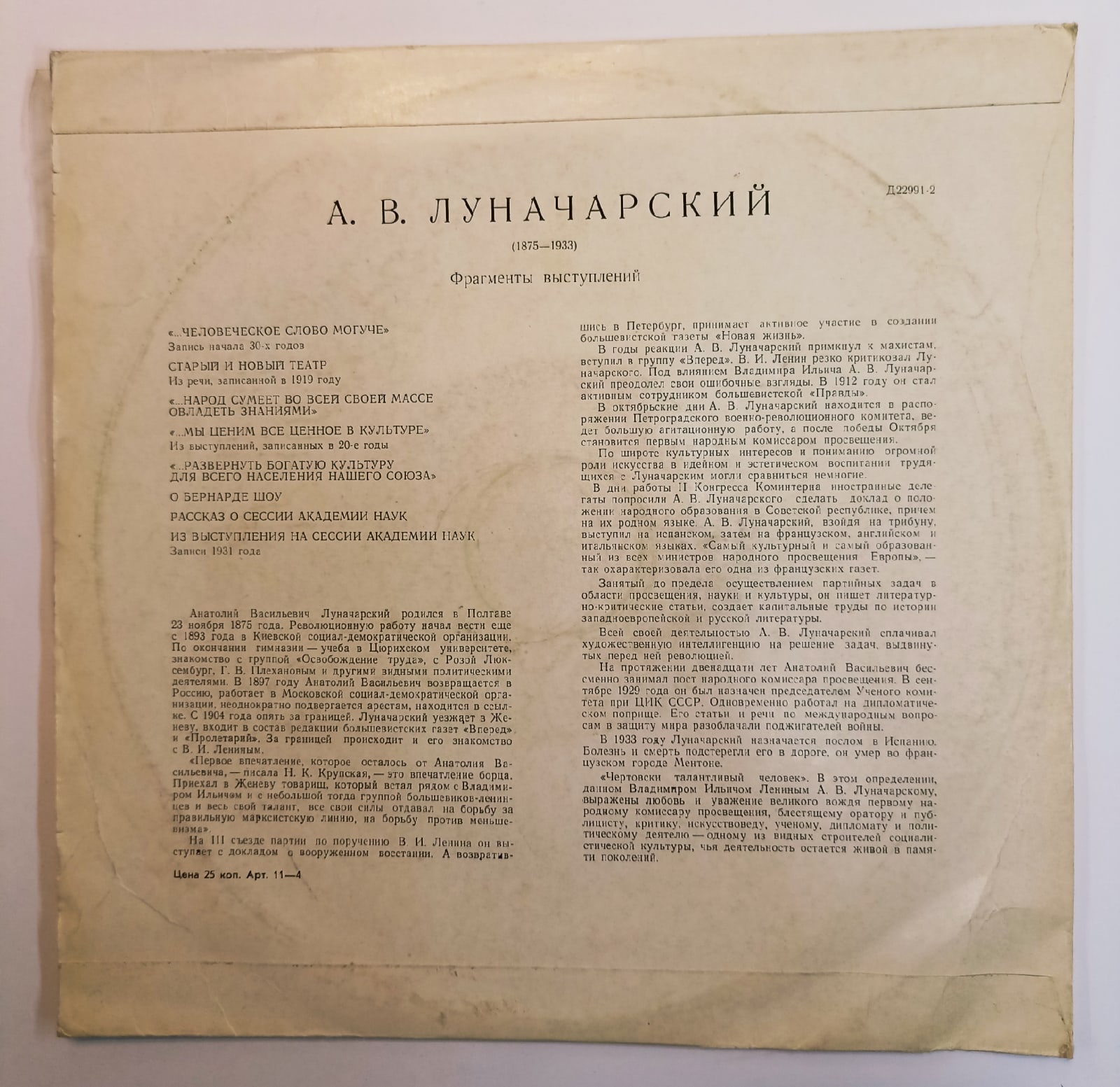 Виниловая пластинка винтажная А. В. Луначарский Фрагменты Выступлений Excerpts From Speeches