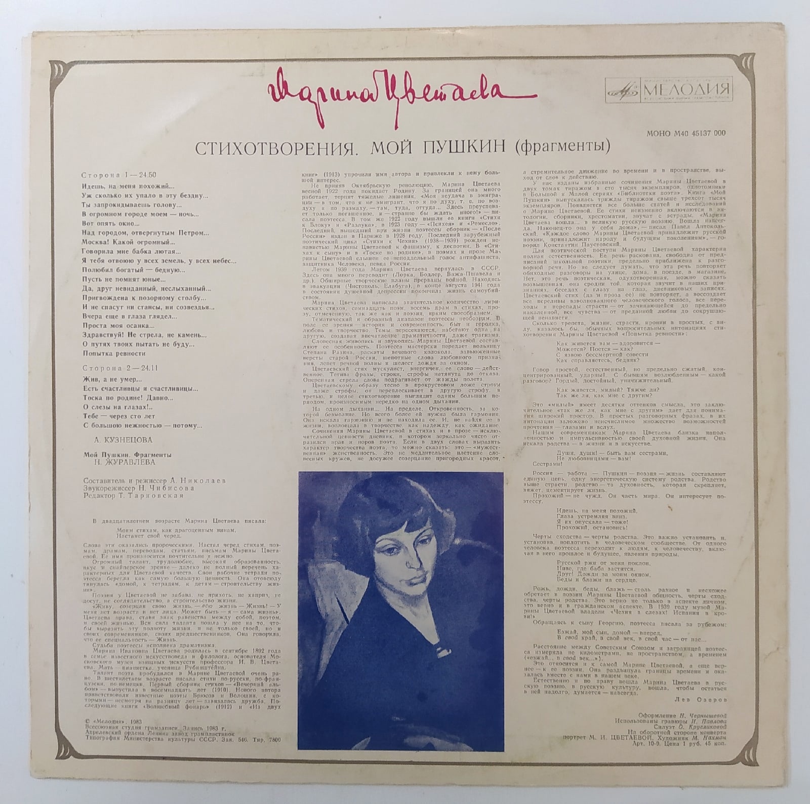 Виниловая пластинка винтажная Марина Цветаева Стихотворения. Мой Пушкин Фрагменты