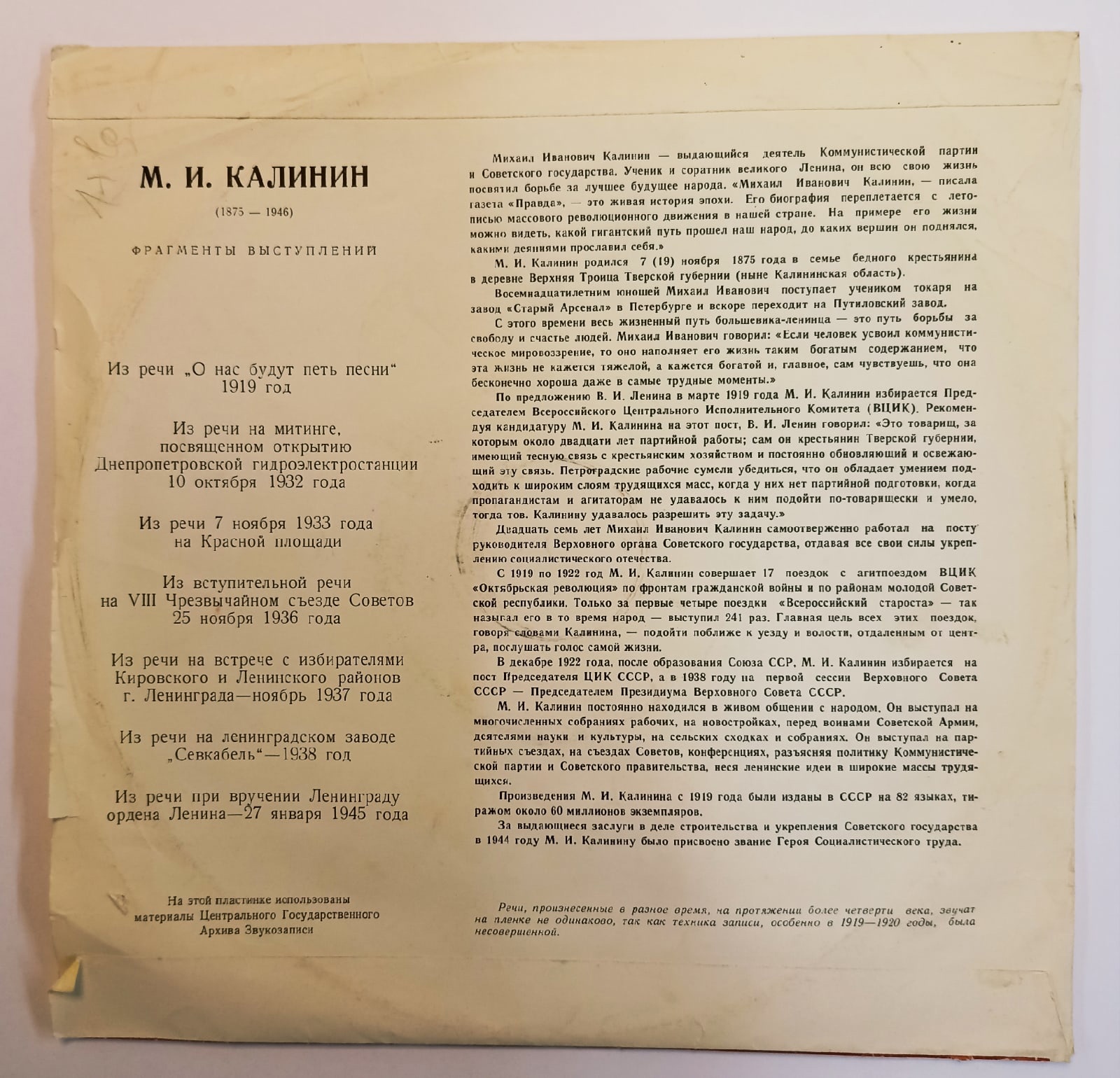 Виниловая пластинка винтажная М. И. Калинин Фрагменты Выступлений
