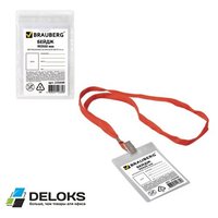 Бейдж BRAUBERG, 90x60 мм, вертикальный, на красной ленте 45 см